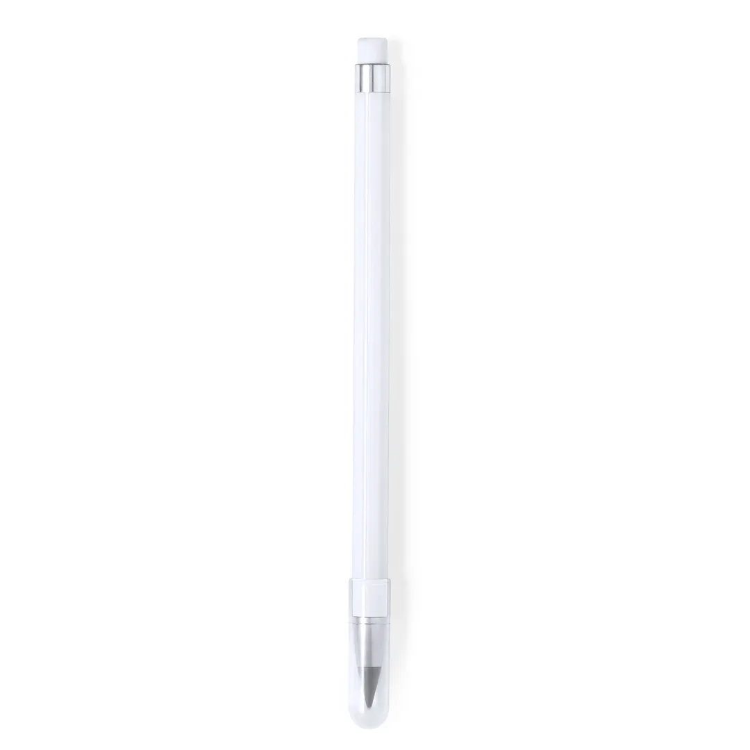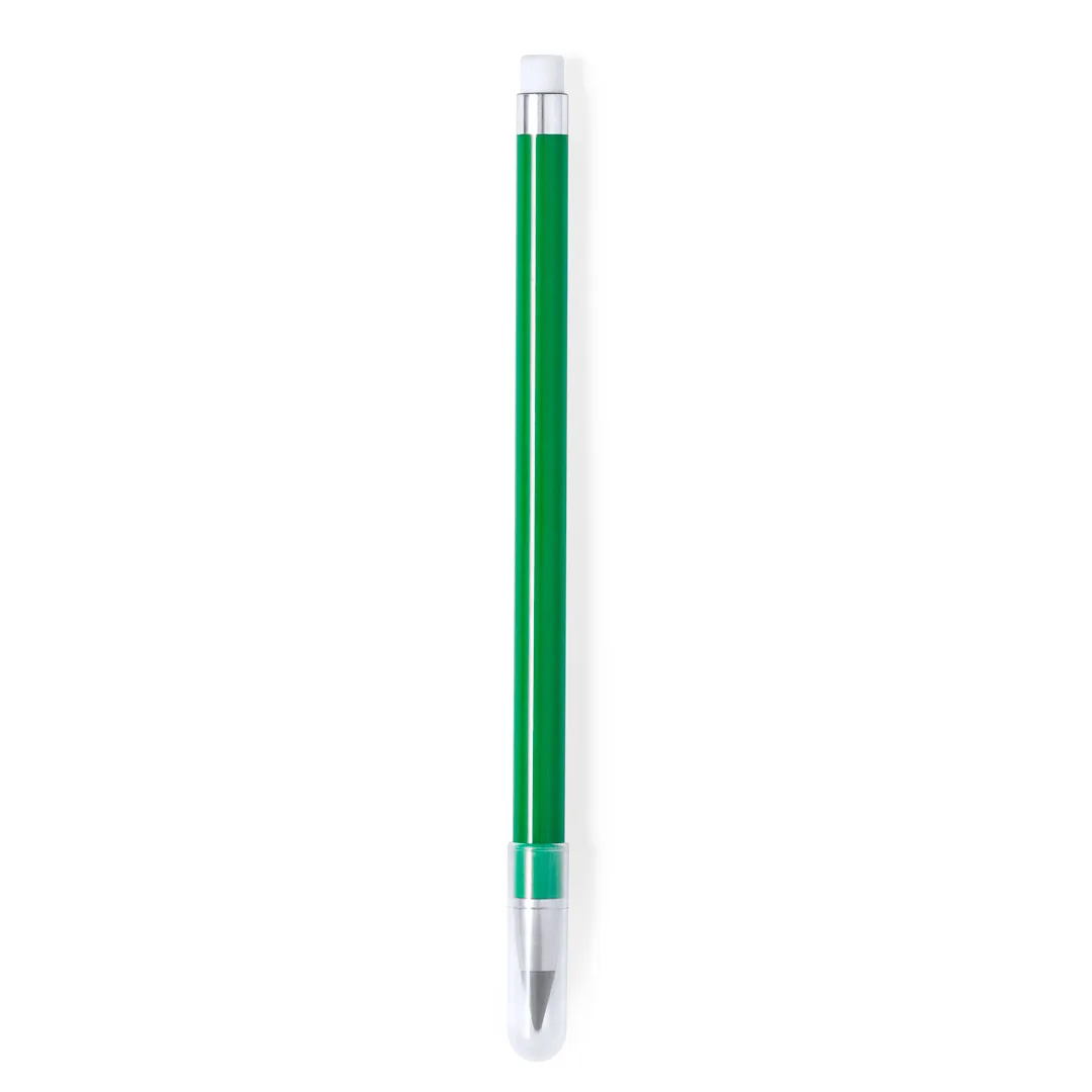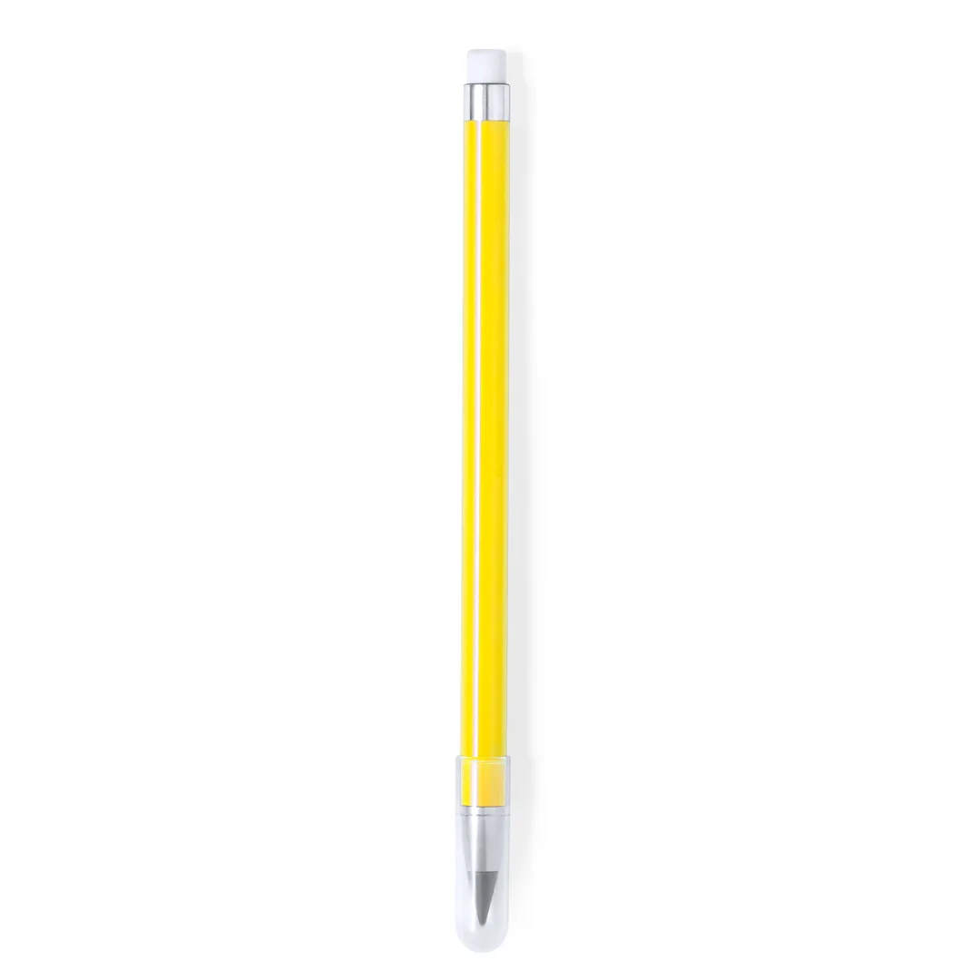 Lápis eterno fabricado em resistente ABS. Reutilizável e com escrita infinita, para usar sempre o mesmo lápis e não gerar resíduos. Inclui borracha na parte superior do lápis, tampa para proteger a ponta, com estilo elegante combinando elementos de cores com elementos em prata. Disponível numa ampla gama de cores.