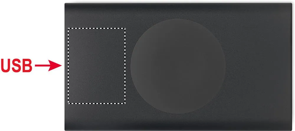 Banco de potência de 5000 mAh com carregamento sem fios de 15 W em alumínio reciclado. Entrada: Tipo C. Saída: 1 x Tipo C e 1 x Tipo A.Powerbank sem fios 15W