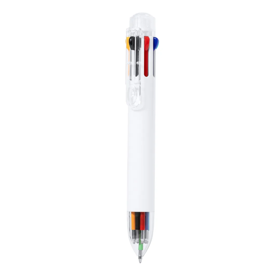 Ref: BEC58012MOEsferográfica com 8 variadas cores de escrita em ABS. Este instrumento de escrita oferece uma variada paleta de cores numa só esferográfica, com uma seleção de 8 cores diferentes para se adaptar a qualquer tarefa. O seu design ergonómico e a sua funcionalidade fazem que se possa selecionar facilmente cada opção graças aos botões de pressão na parte superior. Concebida com corpo de cor branca e clip e acessórios transparentes.