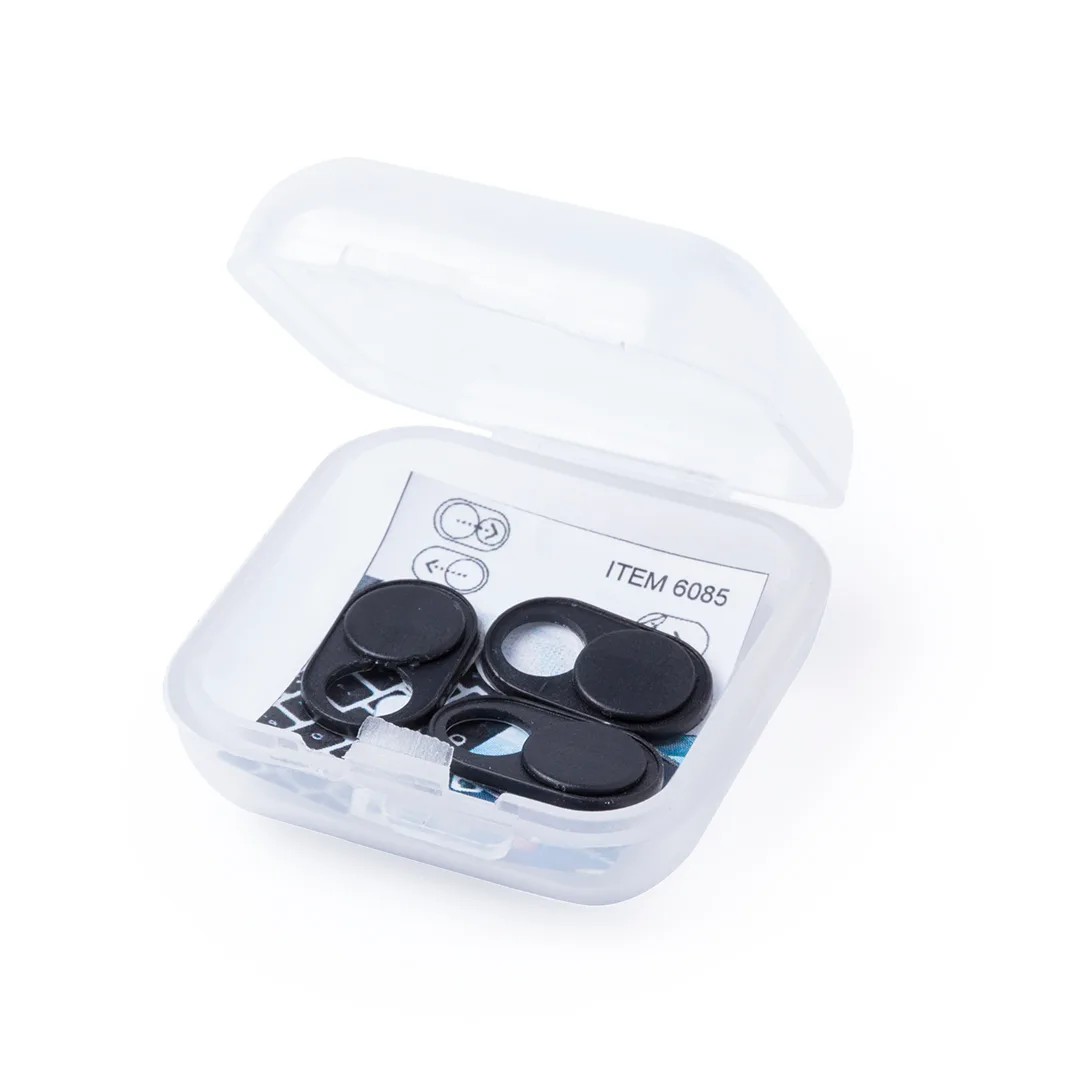 Tapa câmera de dispositivo móvel para proteger a privacidade. Em tamanho ultra compacto e servido numa única caixa translúcida com 3 peças. Disponível nas cores preto e branco, conjunto apresentado em caixa individual com cartão.Adesivo. 3 Peças