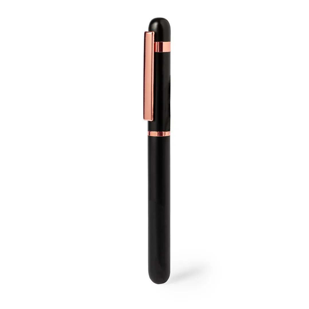 Rolo elegante especialmente concebido para gravação a laser com logótipo rosado. Com clip metálico e detalhes em plástico num acabamento cor-de-rosa. Com carga jumbo, tinta azul e fecho da tampa. Disponível em duas cores diferentes. Apresentado numa elegante caixa de design preta.Alumínio/ ABS/ MetalCarga Jumbo