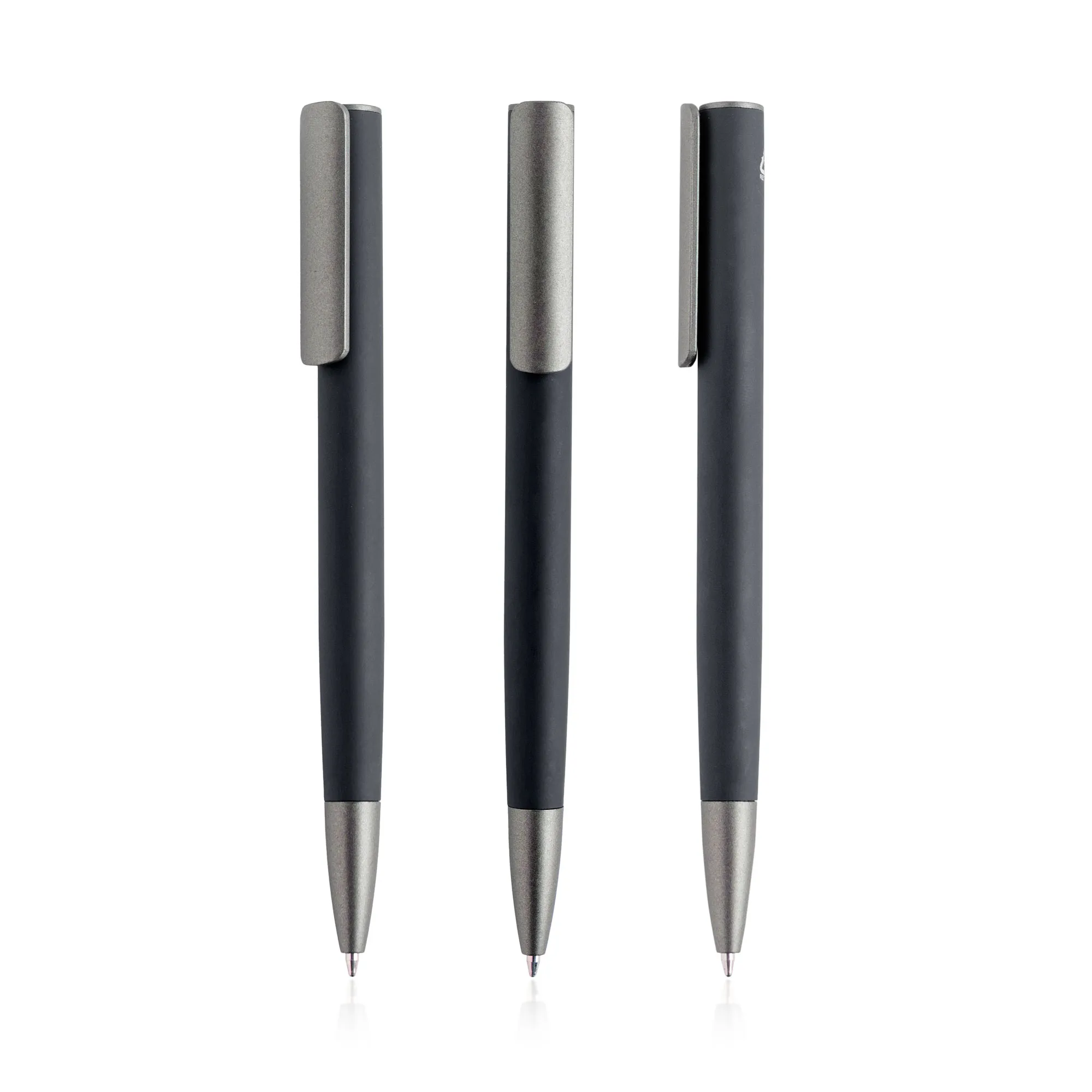 Esferográfica em alumínio reciclado acabamento em borracha. Feita em alumínio reciclado de desperdício e em fim de vida útil, utilizando processos de derretimento e aproveitamento. Ao comprar esta esferográfica, está a ajudar a reduzir as libertações de carbono e a reduzir o lixo que deriva da não reutilização. Esta esforográfica de escrita azul apresenta um toque de borracha, um clip arredondado que lhe dão um ar de modernidade. Esferográfica em alumínio reciclado, acabamento em borracha