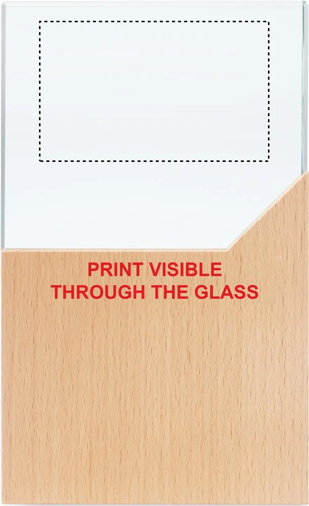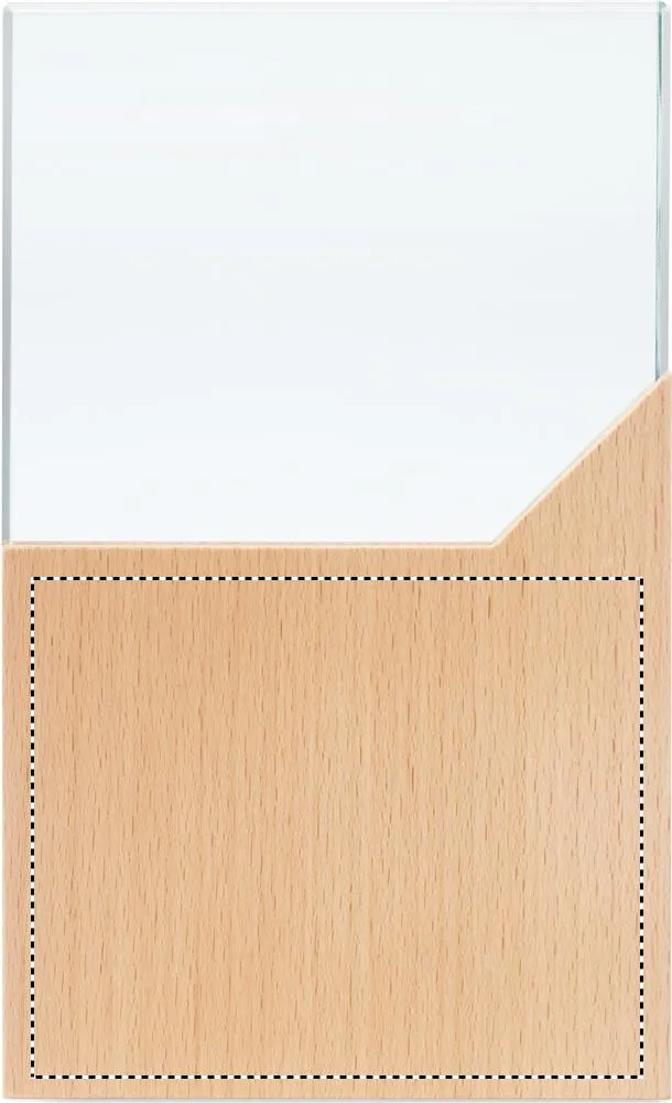 Prémio de cristal ou placa comemorativa sobre uma base de madeira de faia numa caixa de presente.Placa de prémio