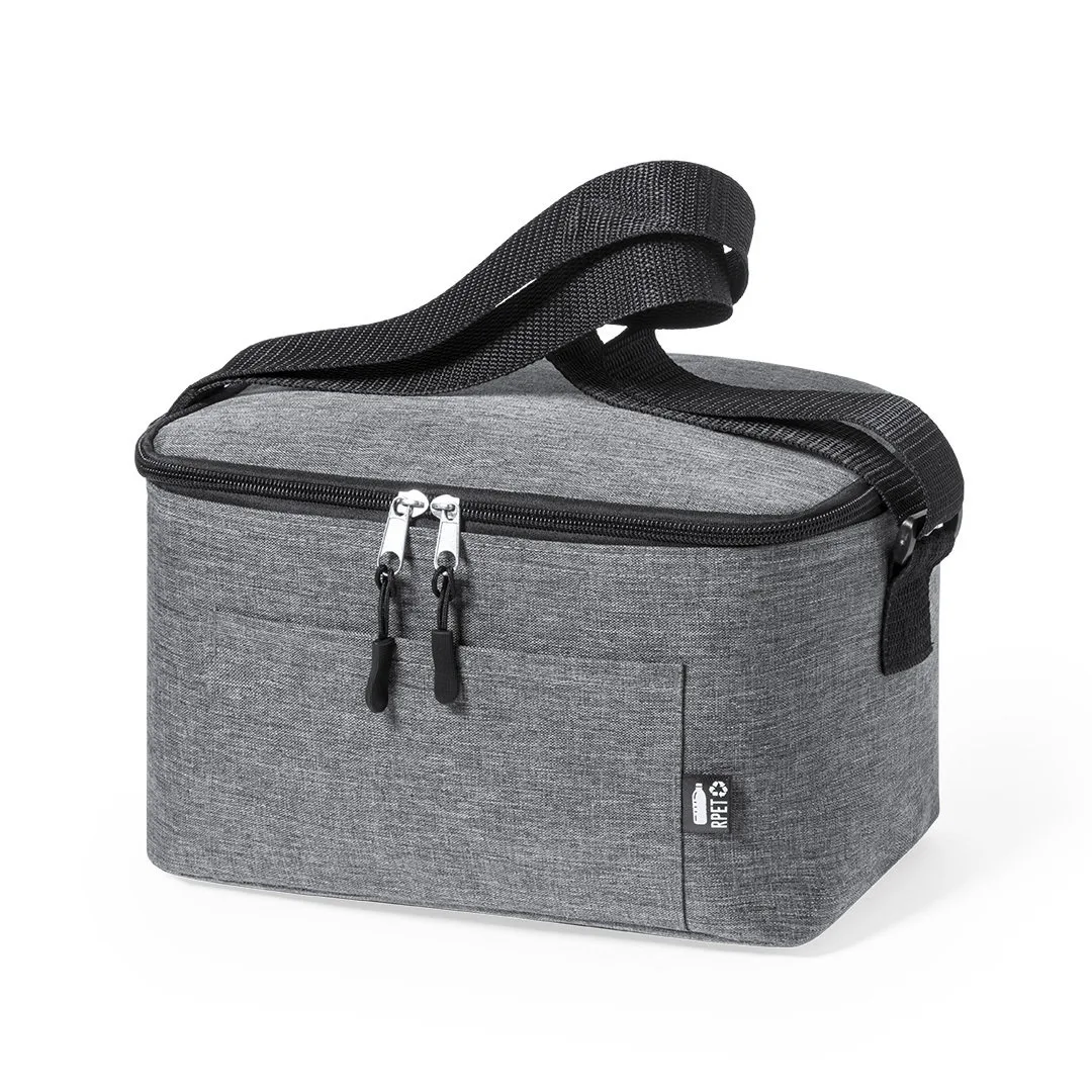 Bolsa refrigeradora de linha nature e em resistente poliéster 600D RPET efeito mélange, elaborado a partir de plástico reciclado para promover a reutilização de resíduos plásticos e contribuir para a sustentabilidade do planeta. Detalhes em negro e base reforçada. Compartimento principal com fecho de correr e interior em alumínio. Inclui bolso exterior e alça de ombro ajustável, com distintivo RPET na etiqueta exterior.Poliéster 600D RPET/ Alumínio