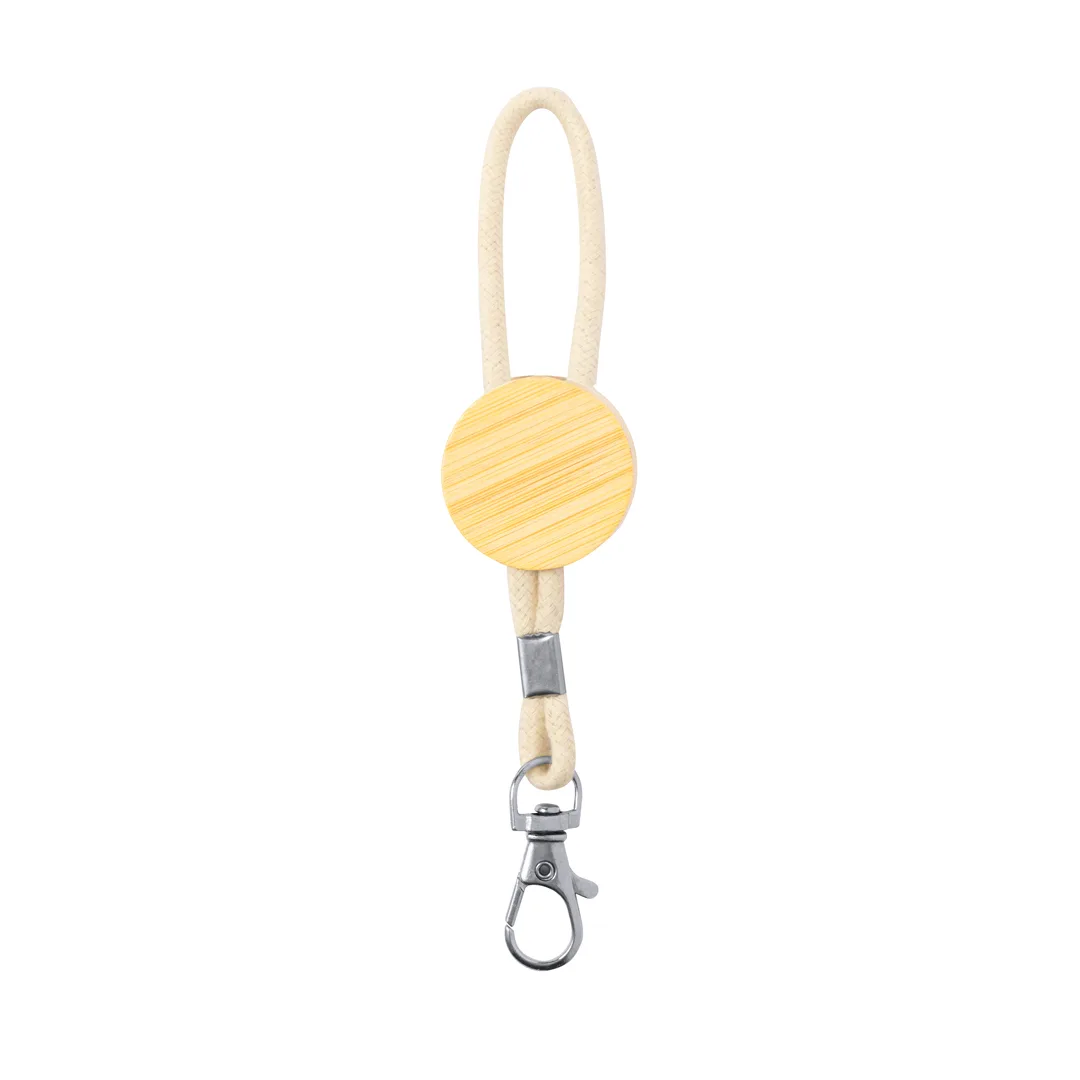 Porta-chaves ecológico feito de bambu e com cordão de algodão. Inclui uma peça redonda especial para impressão e um mosquetão giratório de metal. Apresentado individualmente numa bolsa de papel reciclado.Materiais como o bambu fomentam a utilização de matérias-primas naturais, reduzindo as emissões poluentes. Provém de uma planta de grande resistência e versatilidade, com crescimento e regeneração rápidos, sendo uma excelente alternativa ao uso de madeira tradicional.Algodão/ Bambu