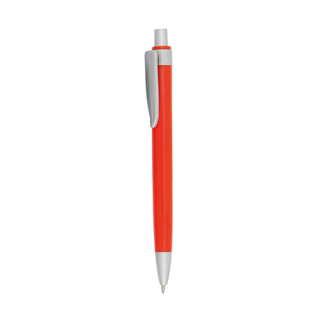 Caneta esferográfica push-up com design arrojado em dois tons com detalhes em cinza prateado e corpo liso em tons brilhantes. Com clipe de cor original correspondente. Tinta azul.