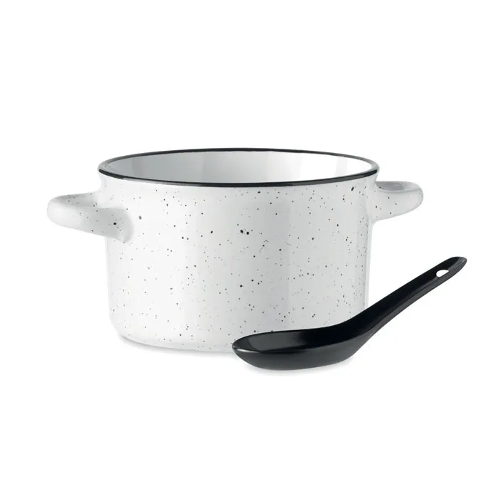 Tigela de sopa em cerâmica estilo vintage com colher. Devido ao padrão malhado, os pontos serão visíveis no logótipo impresso. Capacidade: 550 ml.Tigela vitrocerâmica 550 ml