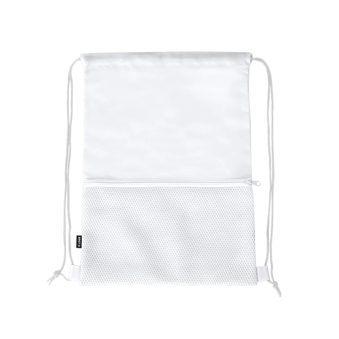 Saco mochila fabricado em suave poliéster RPET 210D. Conta com cordões de fecho automático pretos em argolas de tecido. Inclui um bolso frontal de rede com fecho de correr a condizer. Logotipo RPET na etiqueta lateral e está disponível numa variada gama de cores (cor branca especialmente fabricada para impressão em sublimação).O material RPET é elaborado a partir de plástico reciclado, para assim promover a reutilização de resíduos plásticos e ajudar na sustentabilidade do planeta.Poliéster 210D RPET