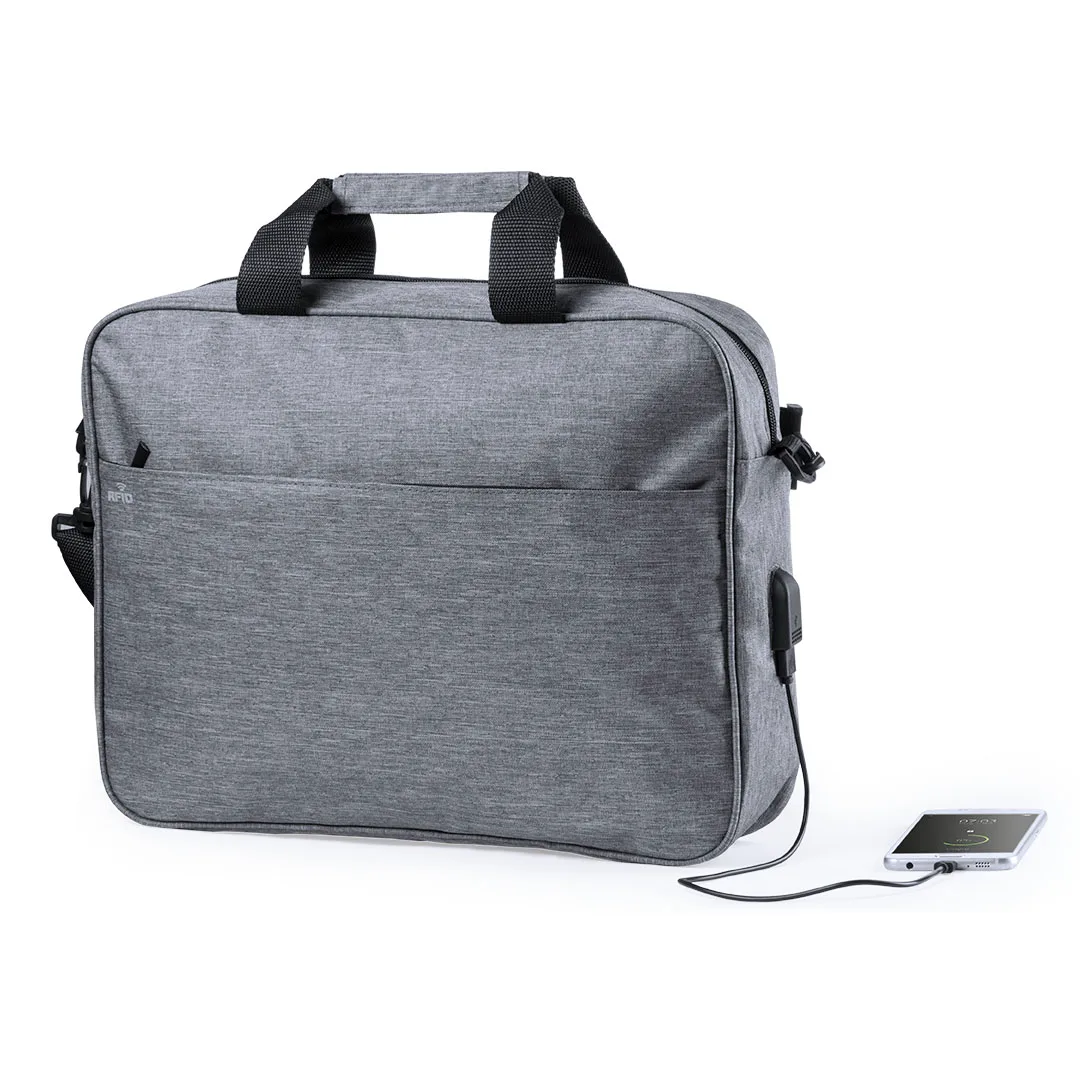 Portadocumentos de segurança, com desenho urbano em poliéster resistente 300D. Bolso interno com proteção RFID (identificação por radiofrequência) que mantém os dados do cartão e de outros dispositivos seguros. Alças com proteção e compartimento principal com fecho de correr. Conexão USB -powerbank não incluído -, com bolso interno acolchoado para portatáteis até 15 polegadas e tablets de até 10 polegadas. Alça ajustável com protetor acolchoado.Poliéster 300DBolso com Protetor RFID. Conexão USB. Bolso Acolchoado para Portátil e Tablet