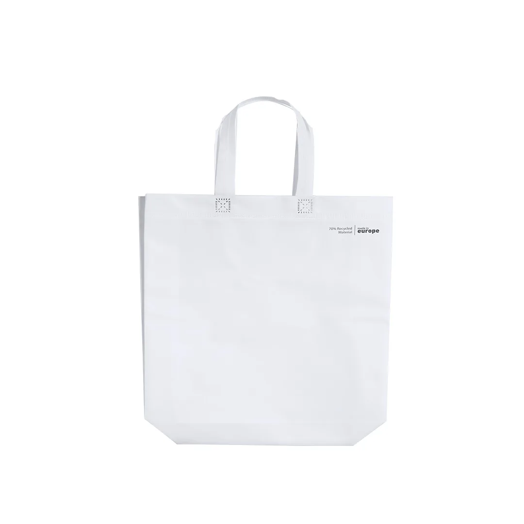 Saco da linha nature, fabricado em non-woven laminado reciclado de 120g/m2. De fabricação europeia, com acabamento termoselado, fole, alças compridas e distintivo eco/made in no sacoNon-Woven Reciclado Laminado