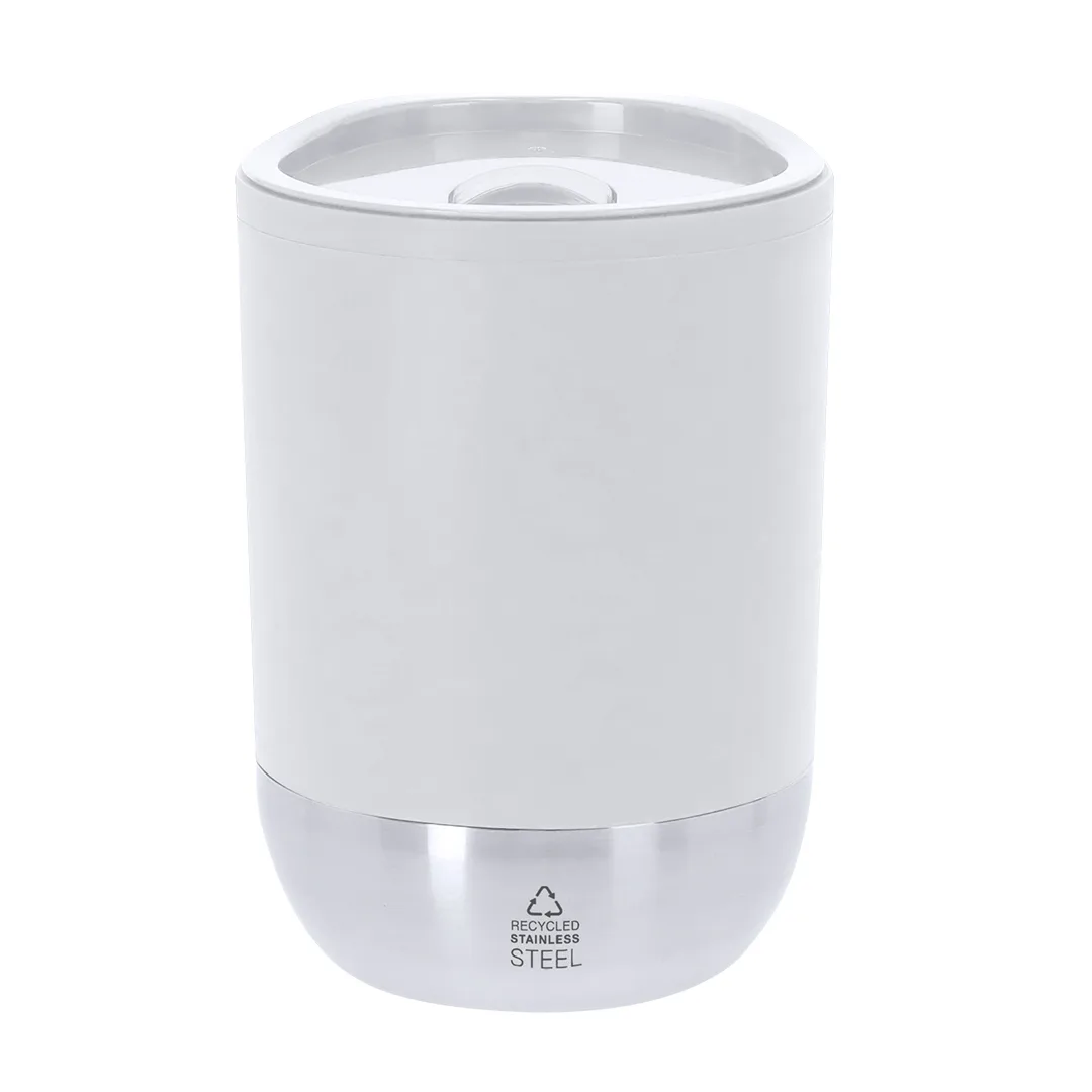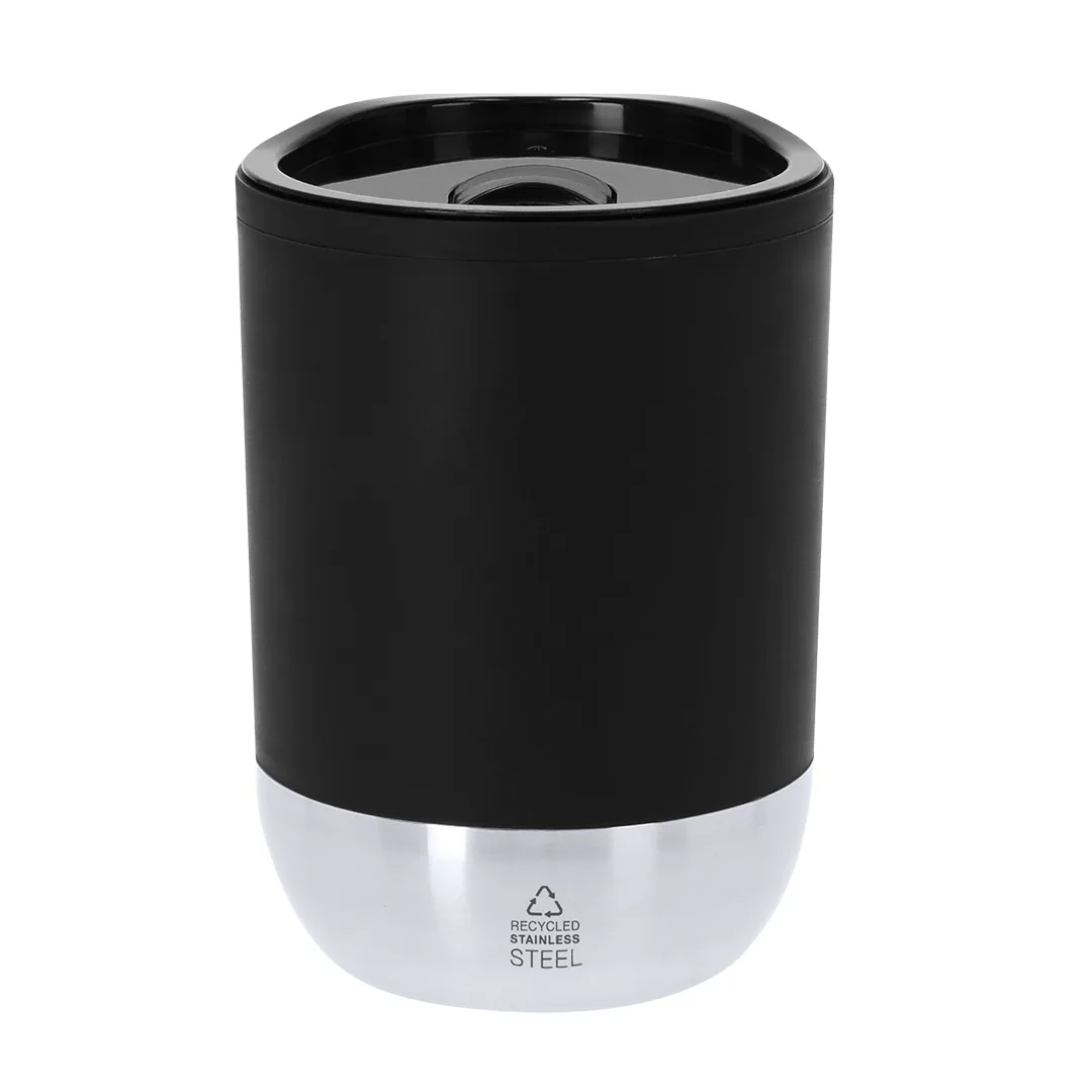 Copo isolado com capacidade de 290 ml. Feito de PP reciclado de parede dupla forte, em combinação com uma base de aço inoxidável reciclado. Tampa de abertura fácil com dispensador, livre de BPA. É ideal para ter na sua escrivaninha, mesa ou em qualquer superfície onde possa desfrutar tranquilamente da sua bebida favorita. Certificado de grau alimentício, garantindo segurança quando alimentos entram em contato com o material usado para fabricar o produto. Com logotipo de aço inoxidável reciclado.O PP reciclado é um plástico reciclado e altamente reciclável, altamente resistente e adequado para uma infinidade de aplicações.O aço é um dos materiais mais procurados e pode ser encontrado quase em todos os lugares, desde produtos do dia a dia até grandes edifícios. Possui inúmeras propriedades, incluindo durabilidade e um alto grau de reutilização, tornando-se uma alternativa altamente valorizada para soluções de sustentabilidade. Tratado adequadamente, permite obter novos recursos de uso infinito.Aço Inox Reciclado/ PP Reciclado290 ml