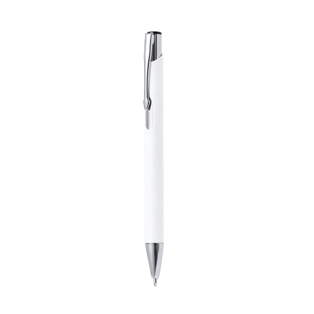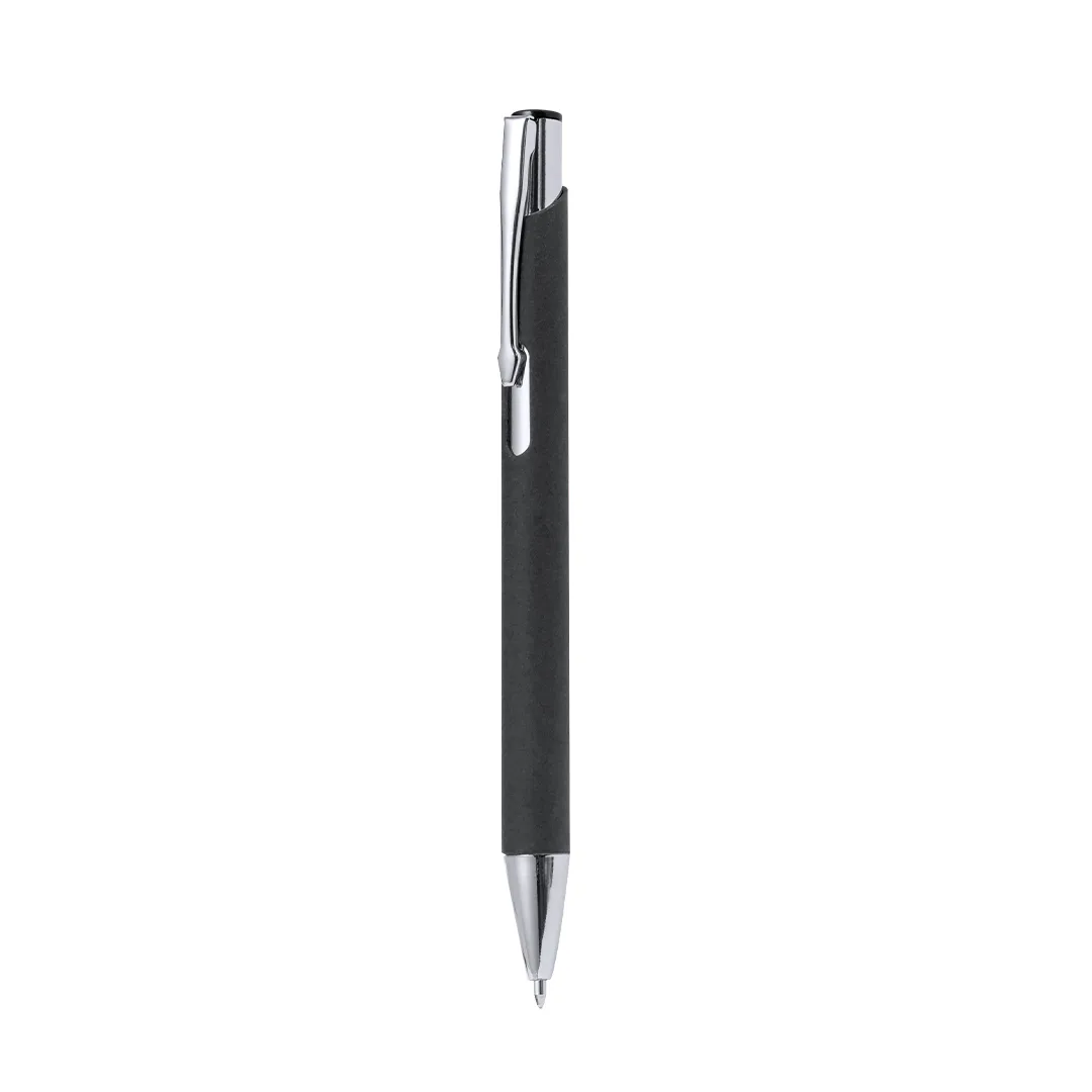Esferográfica com mecanismo pulsador. Combinação de corpo de papel reciclado em cor natural e ferragens metálicas. Disponível em uma ampla gama de cores, com tinta azul.Papel Reciclado