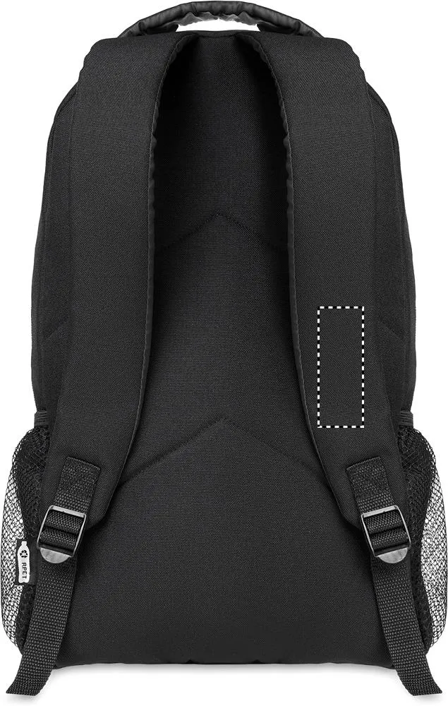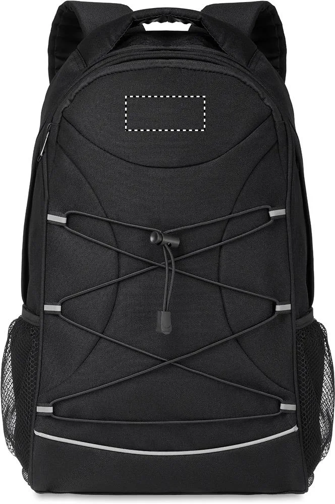 Mochila em 600D RPET com cordões escuros na frente e painel frontal refletor. Bolsos de malha em ambos os lados.Mochila 600D RPET