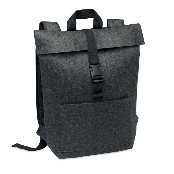 Mochila de feltro RPET com alça de algodão clousre e bolso com fecho de correr na parte da frente. Tem um compartimento para computador portátil.Mochila de feltro RPET
