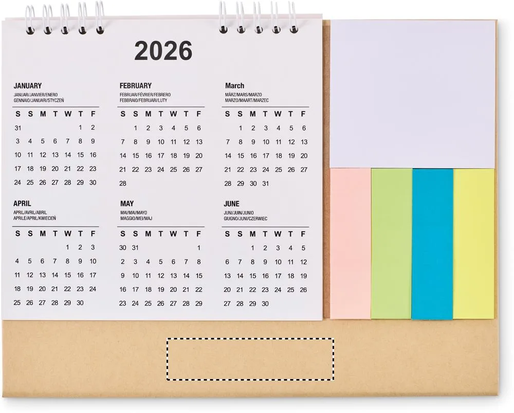 Calendário de secretária de 4 anos com notas adesivas de 3 partes e bloco de notas num suporte de cartão. FSC®-certified | FSC MIX, P8.6, FSC-C213206Calendário de mesa com memopad