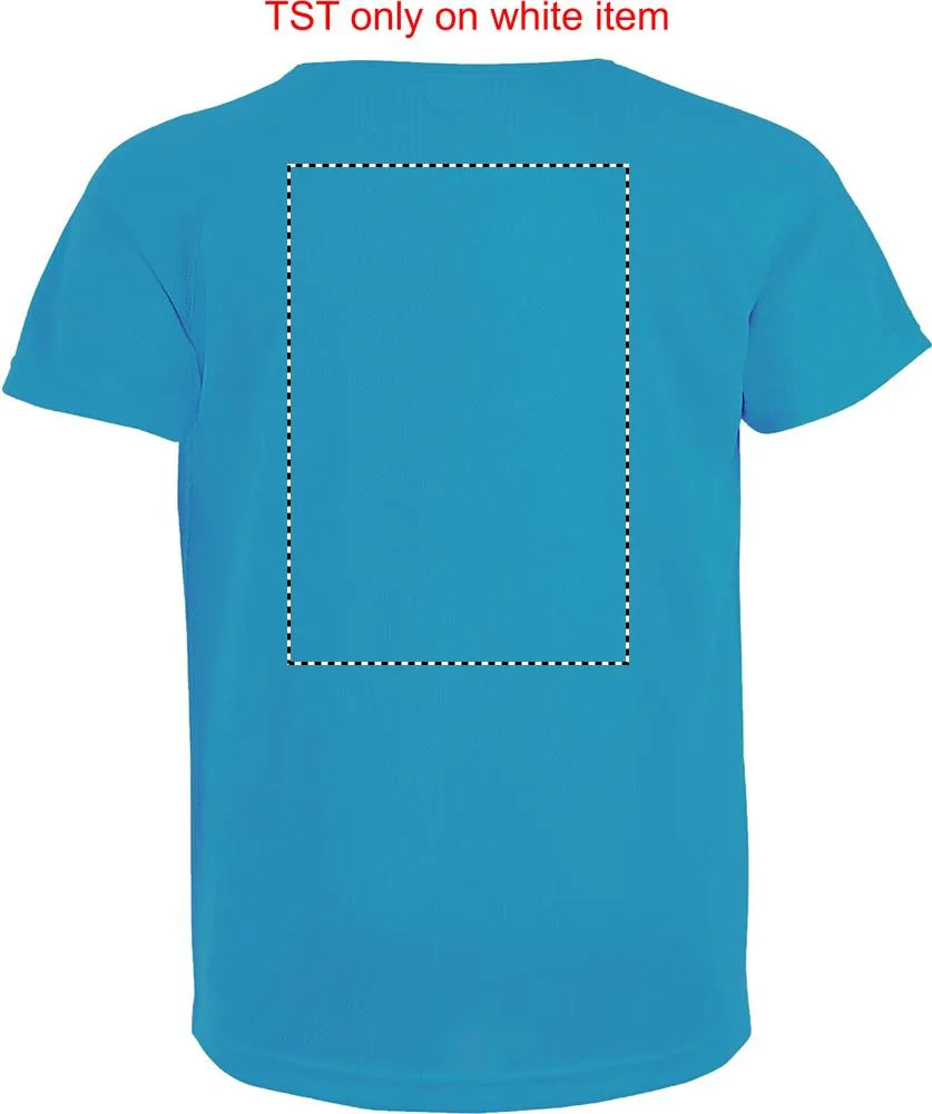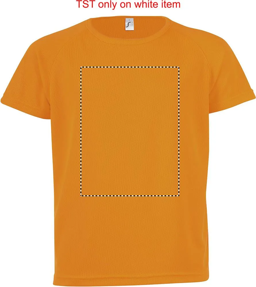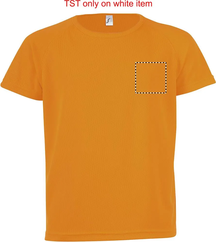 SOL'S SPORTY T-shirt CRIANÇA 140g / m². Seu material respirável, seu corte com mangas raglan e suas costuras planas o tornam o produto ideal para a prática de desporto. Ampla gama de tamanhos e cores, também inclui tons fluorescentes, 100% poliéster respirável, gola canelada, mangas raglan, costas mais compridas. Tamanhos - 6 anos: 106-116cm (XL), 8 anos: 118-128cm (XXL), 10 anos: 130-140cm (3XL), 12 anos: 142-152cm (4XL). Impressão em sublimação apenas dispoível para artigos de cor branca.SPORTY T-SHIRT CRIANÇA 140g