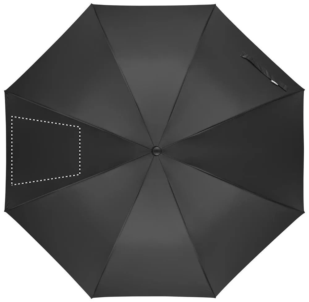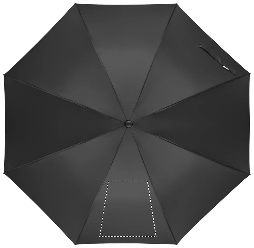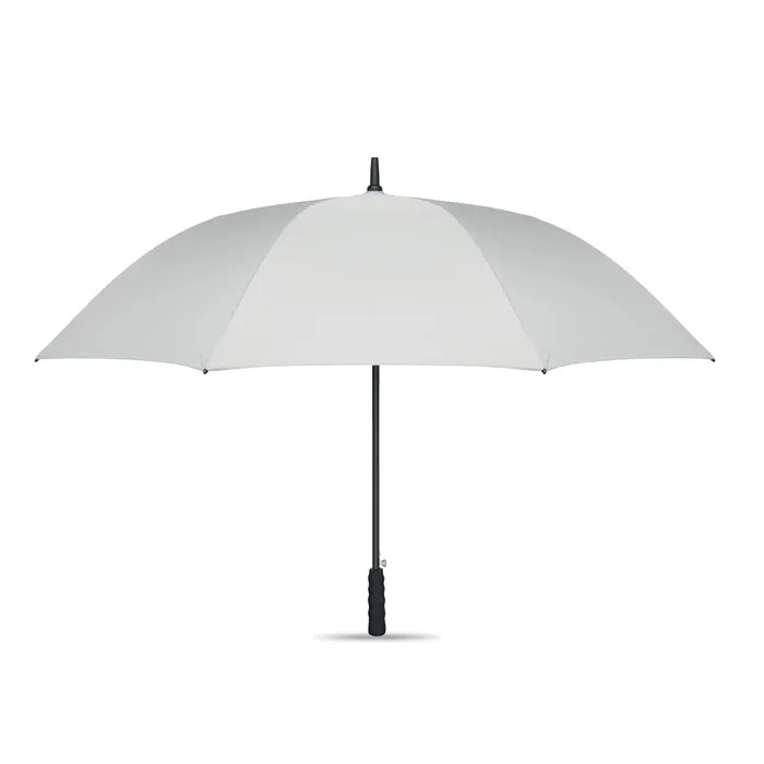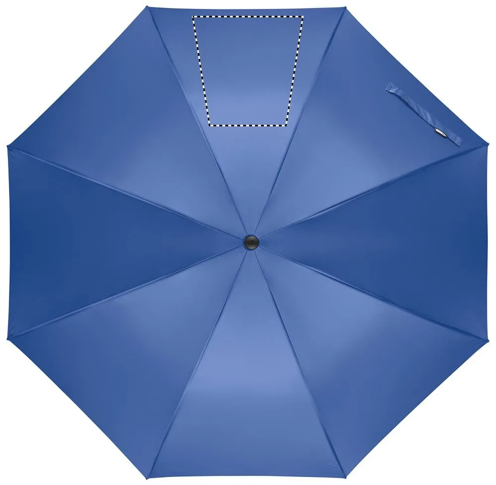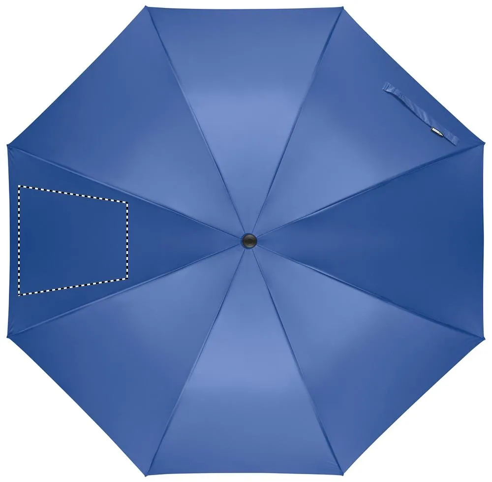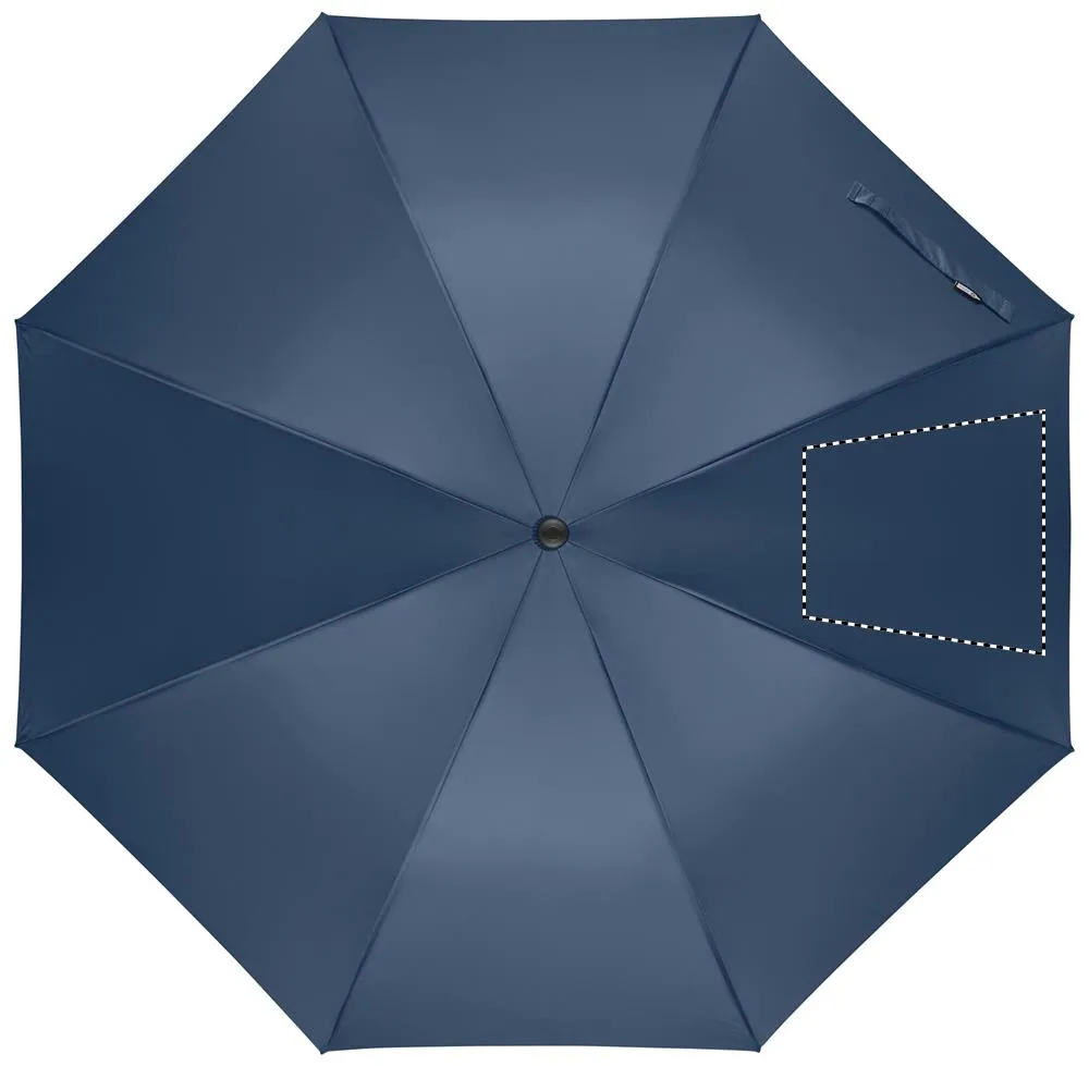 Chapéu de chuva de 27'' com abertura automática e à prova de vento em pongee 190T RPET. Haste e nervuras em fibra de vidro. Pega em palha de trigo e ABS reciclada. Pontas e topo em plástico.Chapéu de chuva de 27"