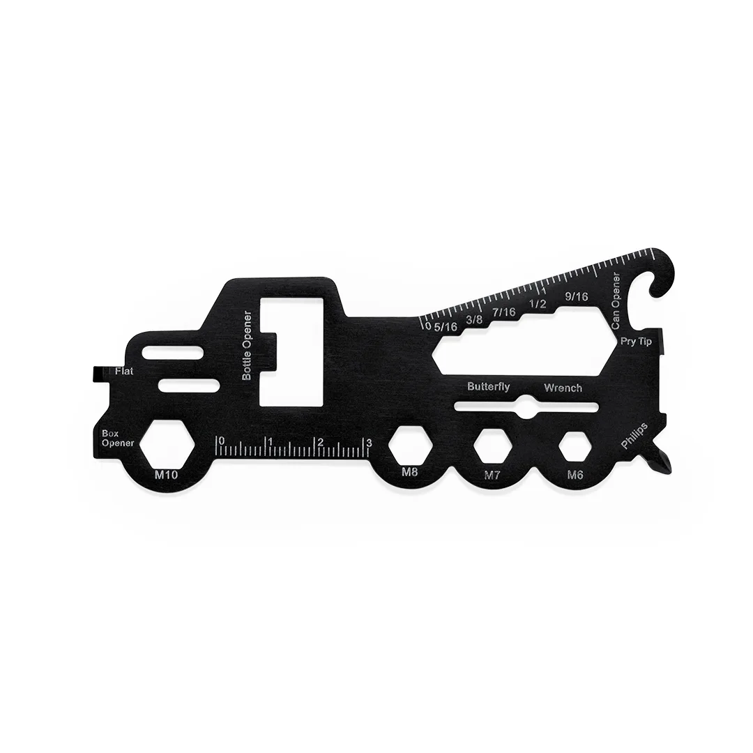 Multi-ferramentas original e prático em aço inox em forma de camião. Com 18 funções, entre outras: chave de fendas plana e philips, chave sextavada de diversos tamanhos, régua, abridor de caixas e abre-cápsulas. Apresentado numa bolsa de papel reciclado.Aço Inox18 Funções