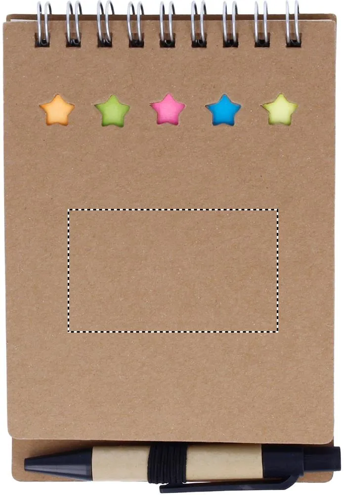 Bloco de notas reciclado com caneta e notas autocolantes. Capa de papel reciclado macio. Com fio duplo. 40 folhas pautadas. Suporte elástico para caneta. 25 blocos de notas autocolantes em papel reciclado e 5 marcadores de páginas de cores variadas. Esferográfica com botão de pressão em cartão reciclado e plástico biodegradável. Tinta azul. FSC MIX CREDIT | P7.1 | FSC-C213206Bloco reciclado com caneta e n