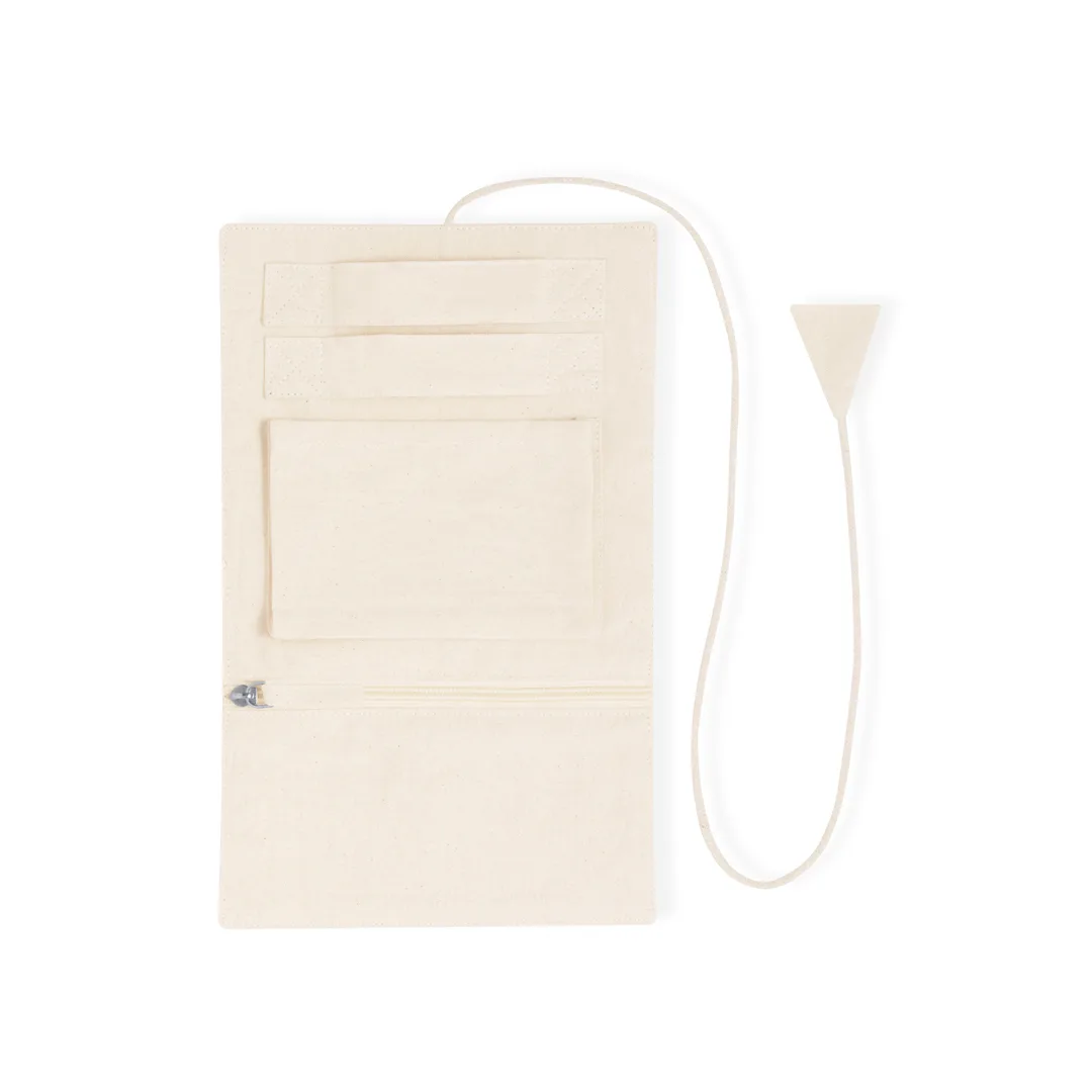 Ref: BEC72502MOPorta-joías dobrável fabricado em algodão, para guardar preciosos artigos pessoais. Confeccionado em 3 partes de cor natural: parte superior com fitas, parte central com bolso e parte inferior com bolso de rede, podendo ser dobrado e guardado firmemente com o seu cordão a condizer.