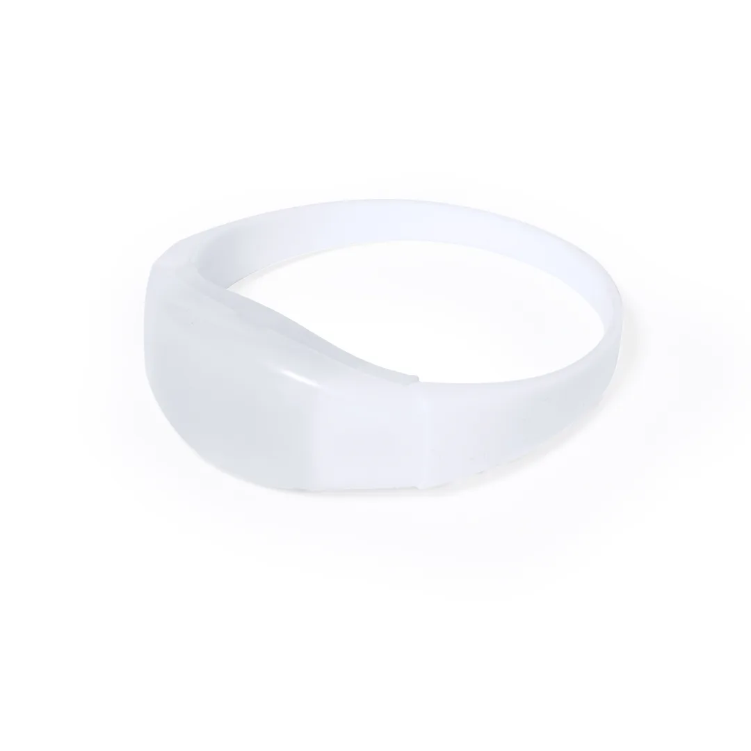 Original pulseira com luzes LED. Em suave silicone e com 2 luzes LED de cor no seu interior, alimentadas por pilha de botão (incluída). Com discreto interruptor sensível ao som e que muda automaticamente a cor das luzes ao ritmo da música. Apresentada individualmente numa bolsa de papel reciclado.SiliconeLuzes Led Multicolor. Pilhas Botão Incluídas