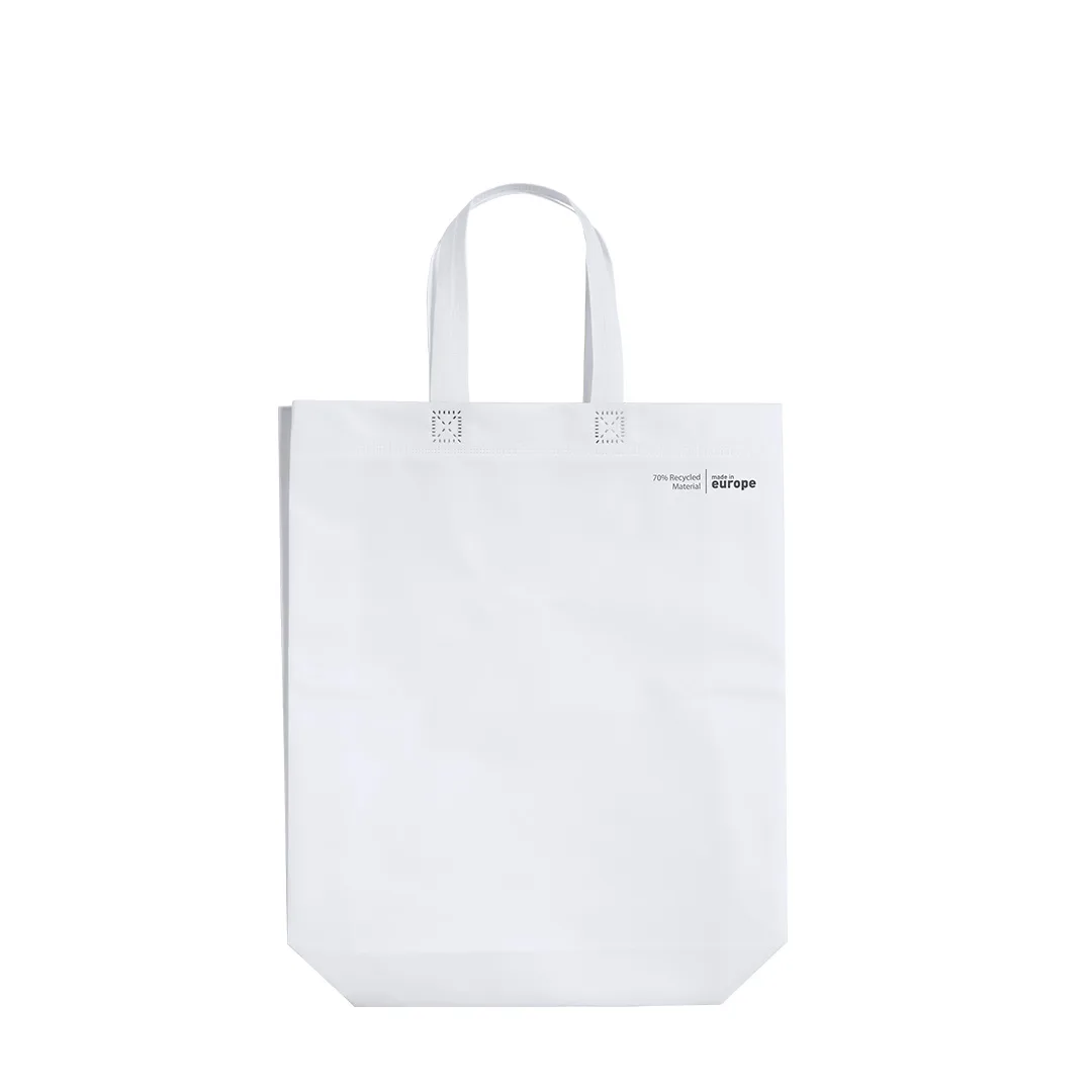 Saco da linha nature, fabricado em non-woven laminado reciclado de 120g/m2. De fabricação europeia, com acabamento termoselado, fole, alças compridas e distintivo eco/made in no saco.Non-Woven Reciclado Laminado