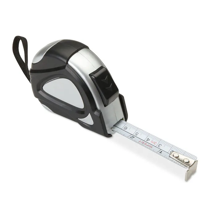 Fita métrica prateada e preta em ABS com 3m. Inclui fita e clip prateado brilhante.Fita métrica 3M