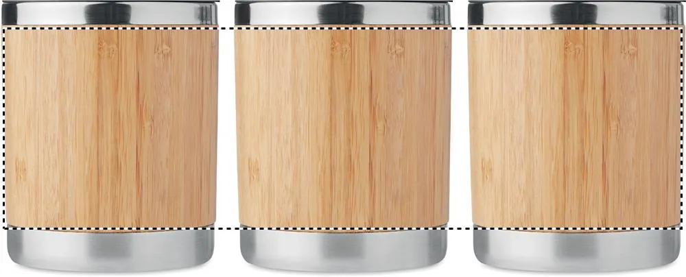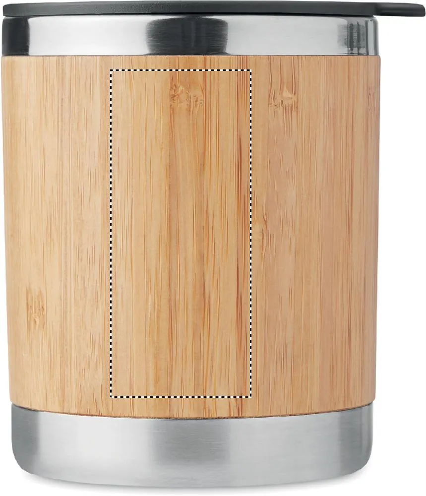 "Copo de aço inoxidável de parede dupla com caixa de bambu e furo para bebidas móvel. Capacidade 250 ml. O bambu é um produto natural; pode haver pequenas variações de cor e tamanho por item, o que pode afetar o resultado final da impressão."Copo capa de bambú 250 ml