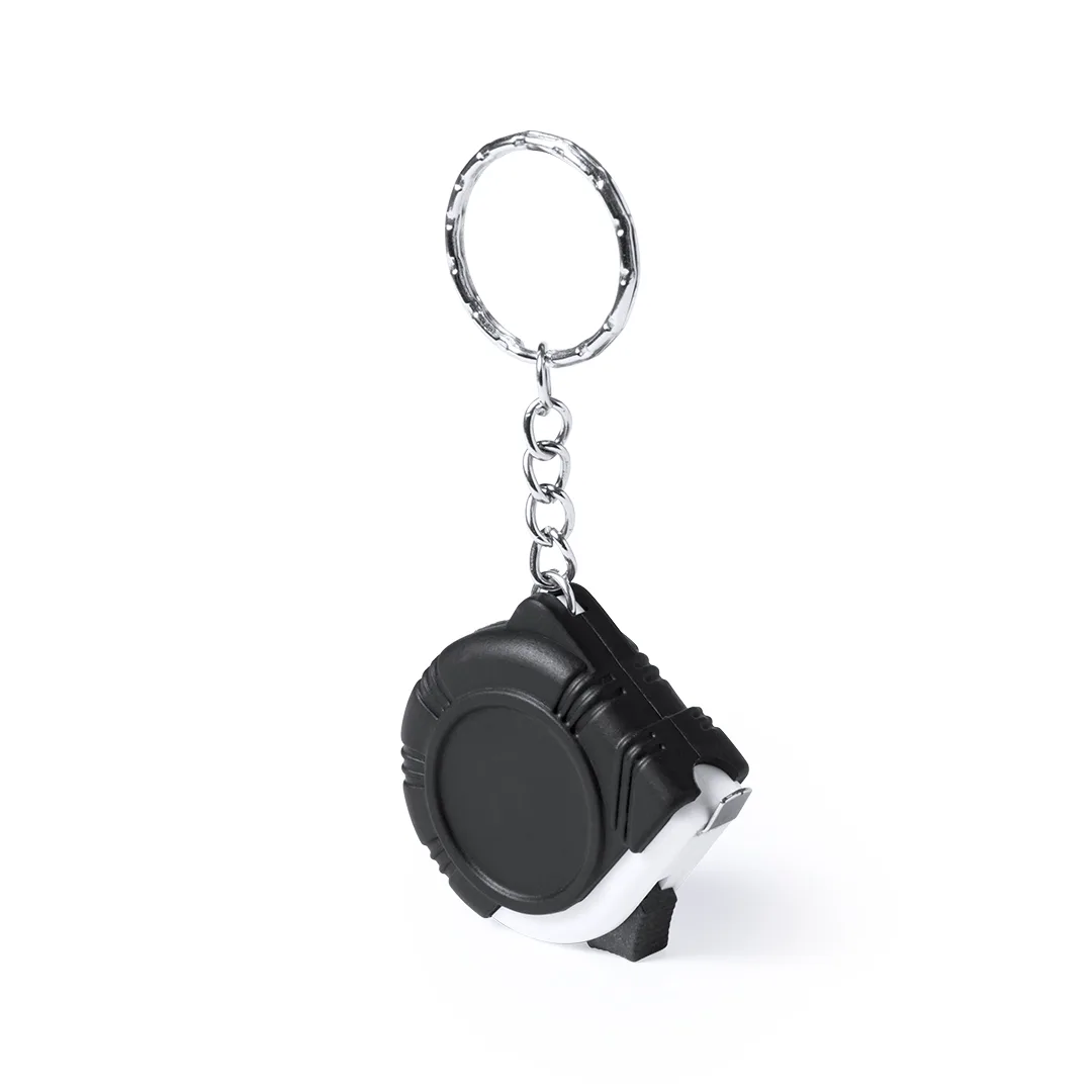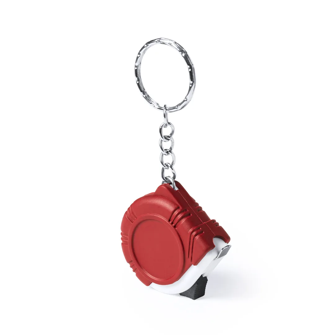 Flexômetro de chaveiro de 1 metro com lâmina de metal e mecanismo de travamento. Sistema de medição em centímetros, polegadas e pés. Com corte especial para impressão.Com Travão