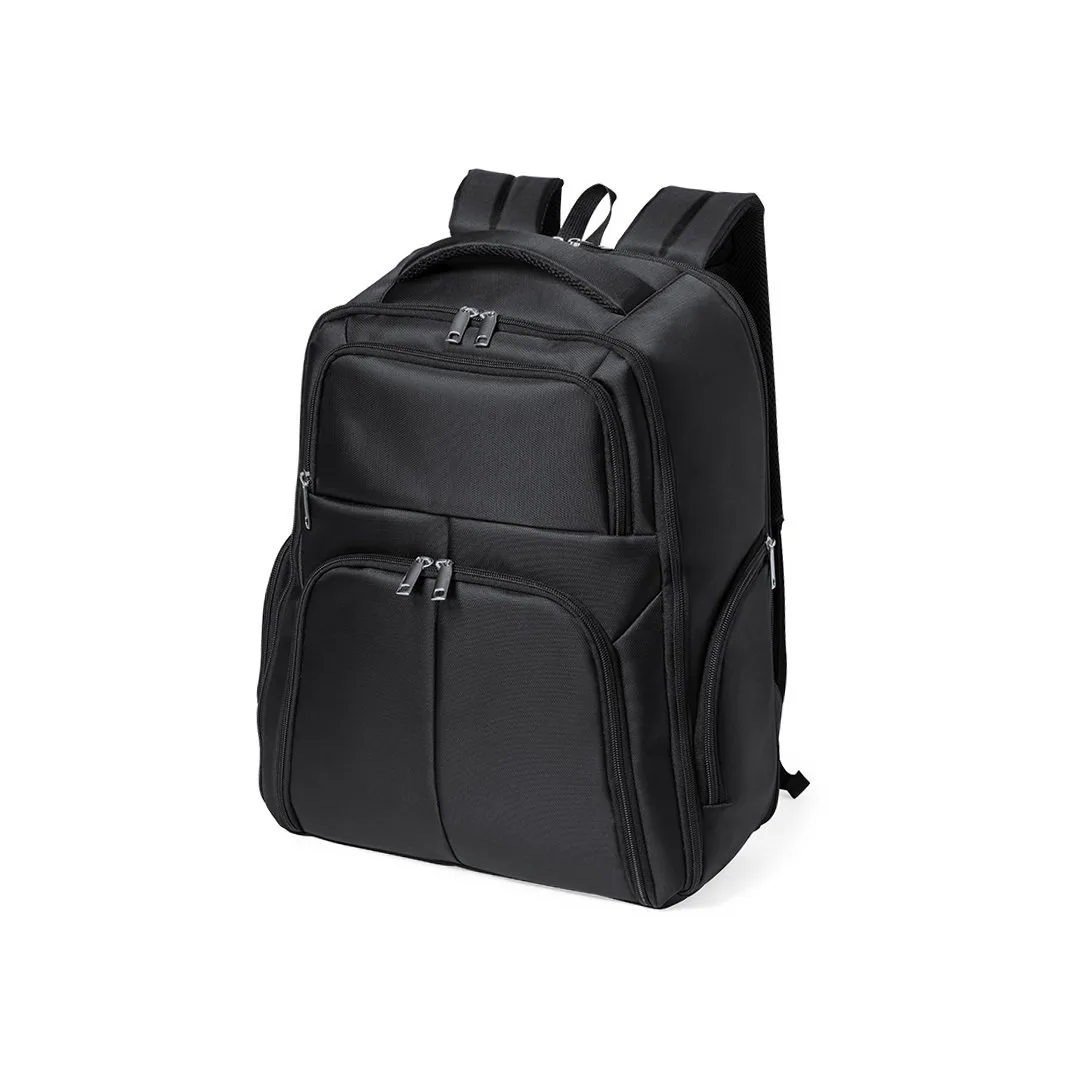 Mochila de qualidade premium fabricada em resistente Nyon 600D de acabamento em cor preto. Compartimento principal com fecho de correr a condizer e duplo puxador. Inclui 3 bolsos exteriores e 2 bolsos laterais, todos com fecho de correr. Acolchoado na pega, parte traseira e alças para ombros, que além disso são ajustáveis. Interior com compartimentos acolchoados para computador portátil de até 17 polegadas e tablet de até 12 polegadas. Acessório nas costas para ajuste em trolley.Nylon 600DBolso Acolchoado para Portátil e Tablet. Parte Traseira e Alças Acolchoadas