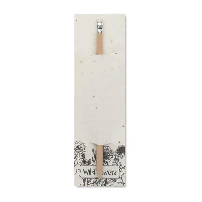 Lápis de madeira natural com borracha. Apresentado em papel de sementes (flores silvestres).Lápis em bolsa com sementes