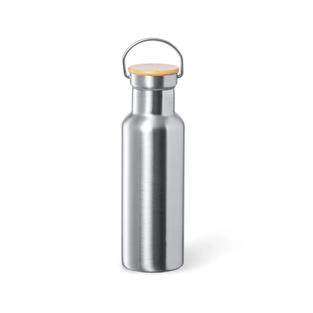 Garrafa térmica de 500 ml de capacidade, fabricada em aço inox de dupla parede e acabamento mate. Inclui original tampa de rosca em aço inox, com detalhe de bambu e pega integrada. Livre de BPA e apresentada em caixa individual de design kraft.Aço Inox/ Bambu500 ml