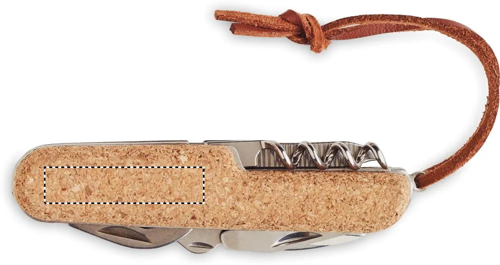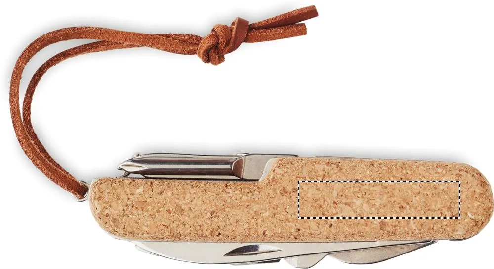 Canivete multifunções em aço inoxidável com cobertura de cortiça e cabo em PU. 7 funções. Inclui 2 abridores, faca, tesoura, chave de fendas com pontas Philips, lima e abre-vinhos. A cortiça é um material natural, devido à sua natureza estrutural e porosidade da superfície, o resultado final da impressão por item pode ter desvios.Canivete multiusos em cortiça
