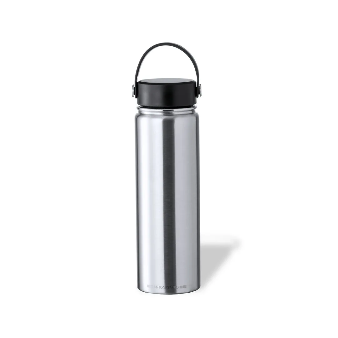 Garrafa térmica Antonio Miró e 650 ml de capacidade. Fabricada em aço inox com parede dupla e acabamento acetinado. Com tampa de rosca em preto e fita de transporte a condizer em silicone. Com logotipo Antonio Miró no corpo e apresentado numa caixa preta individual com logotipo da marca.Manual de instruções disponível em espanhol e inglês.Aço Inox650 ml