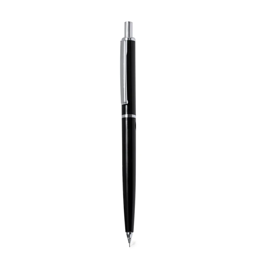 Elegante lapiseira feita em resistente ABS. Corpo na cor preta e cabo a condizer de toque suave, com elementos cromados, como botão, clip, ponta e anel central. Com borracha e minas de 0,7 mm incluídas.Minas 0,7 mm Incluídas