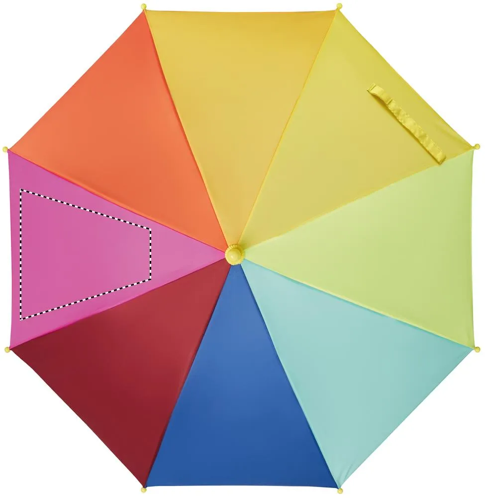 Chapéu de chuva infantil de 18'' em pongee 190T com padrão arco-íris. Possui 8 painéis. Abertura e fechamento manuais. Costelas e moldura em fibra de vidro. Cabo e pontas de plástico. Alça curva.Chapéu de chuva 18" crianças