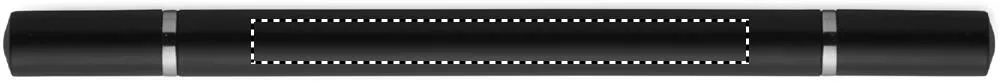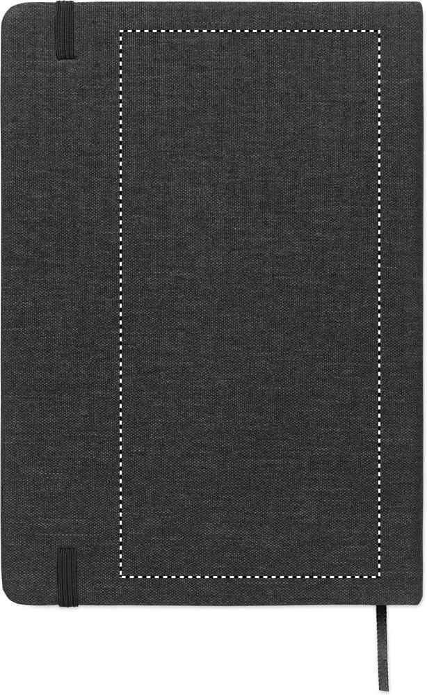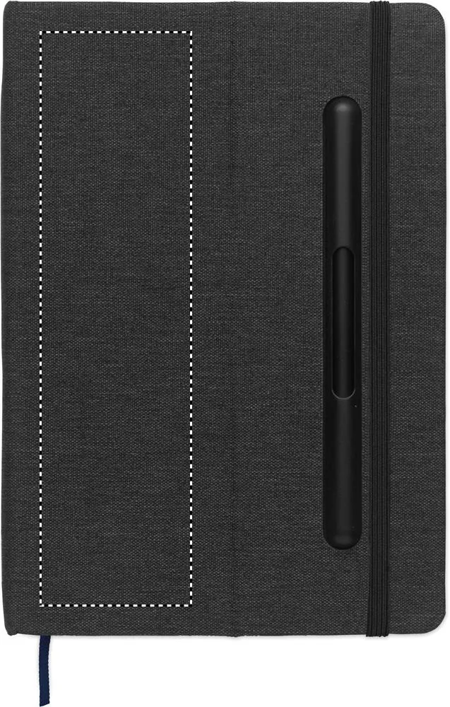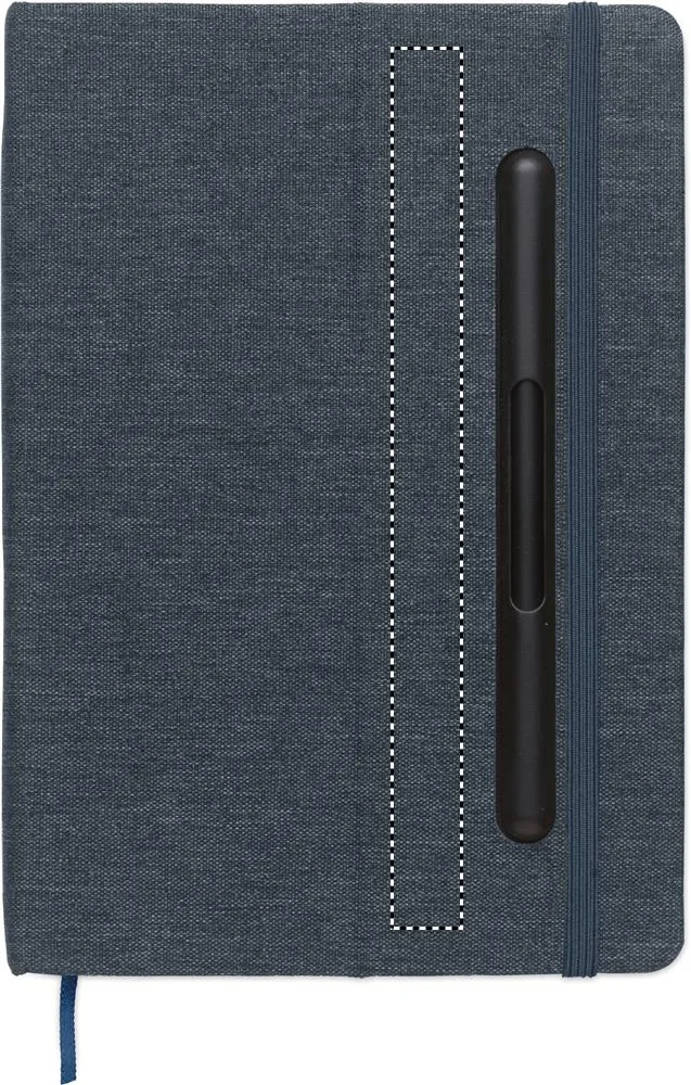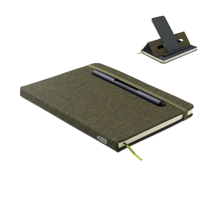 Bloco de notas A5 com capa rígida em RPET com funcionalidade de suporte para telemóvel. Esferográfica 2 em 1 sem tinta e normal integrada em ABS. 192 páginas pautadas em papel reciclado (96 folhas). Alça e marcador de livros a condizer.Bloco de notas A5 com suporte