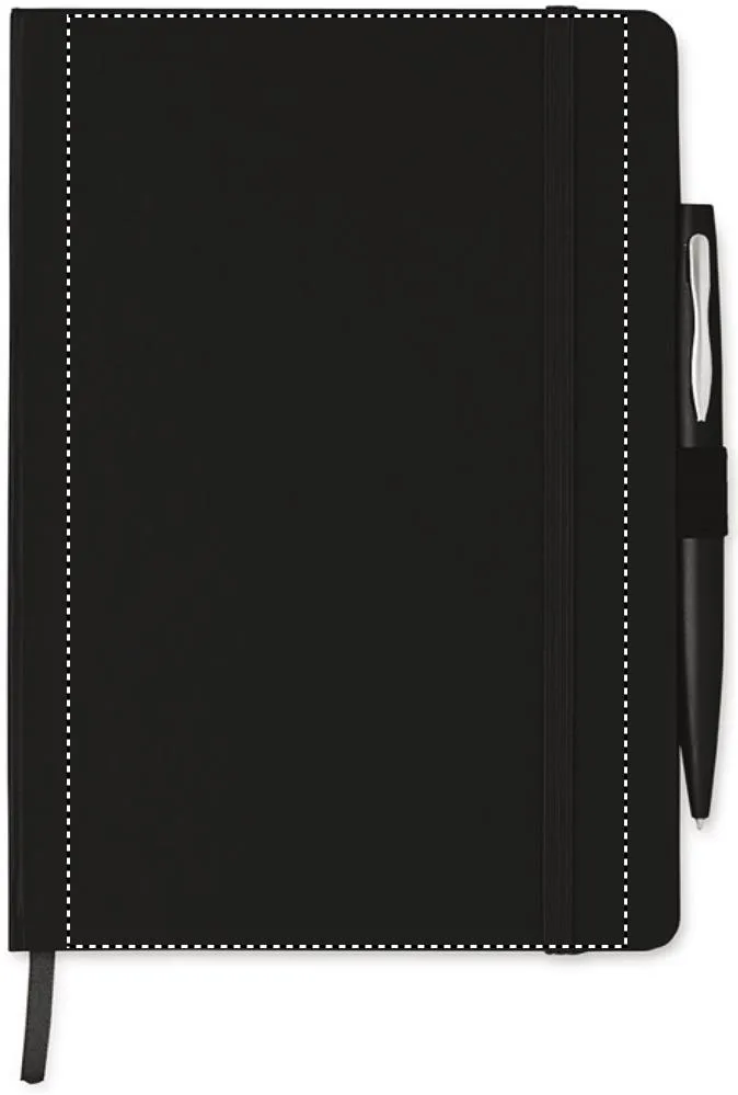 Bloco A5 com capa dura. 72 folhas pautadas. Fita elástica e marca página. Inclui caneta tinta azul.Bloco A5 com caneta