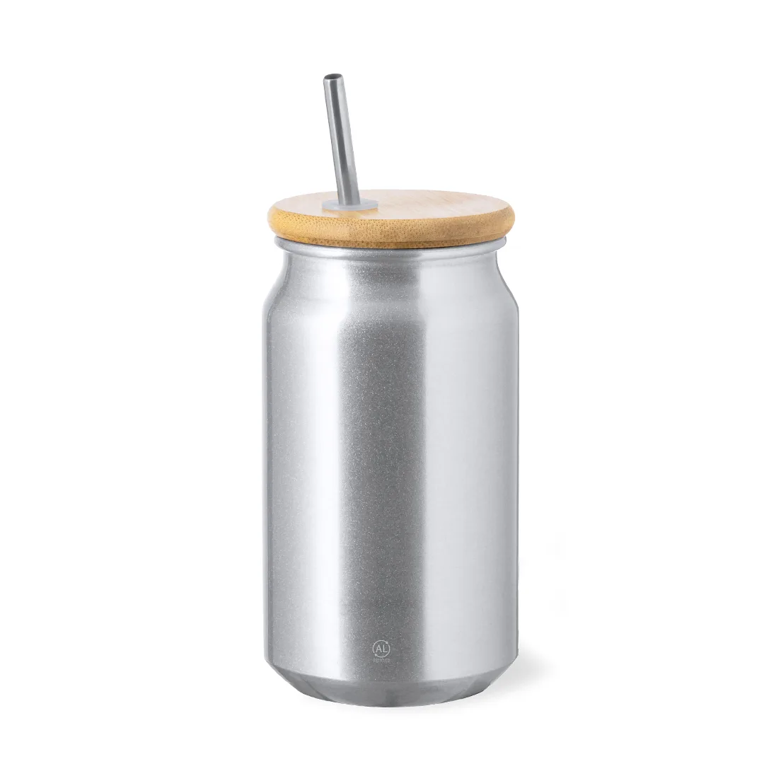Copo de 430 ml de capacidade. Fabricado em elegante e sustentável alumínio reciclado. Com tampa de bambu a pressão com orifício para a palhinha e palhinha reutilizável de aço inoxidável. Com distintivo de Alumínio Reciclado. Apresentação individual numa caixa de design kraft e numa bolsa reciclada.O alumínio reciclado é um material com posisbilidades de reciclagem quase infinitas, sem perder as suas propriedades originais e consumindo menos energia neste processo.Certificação GRS (Global Recycled Standard / Standard de Reciclagem Global), que garante a origem reciclada do material usado para fabricar o produto.Alumínio Reciclado/ Bambu430 ml