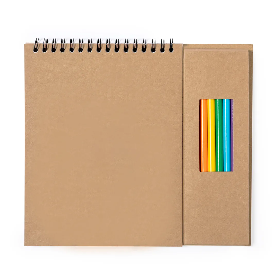 Ref: BEC80402MOFantástico set de lápis e bloco feito em cartão reciclado. Contém estojo com janela de 8 lápis com corpo hexagonal de variadas cores e um bloco de notas de argolas com 6 folhas de motivos naturais e 18 páginas em branco.