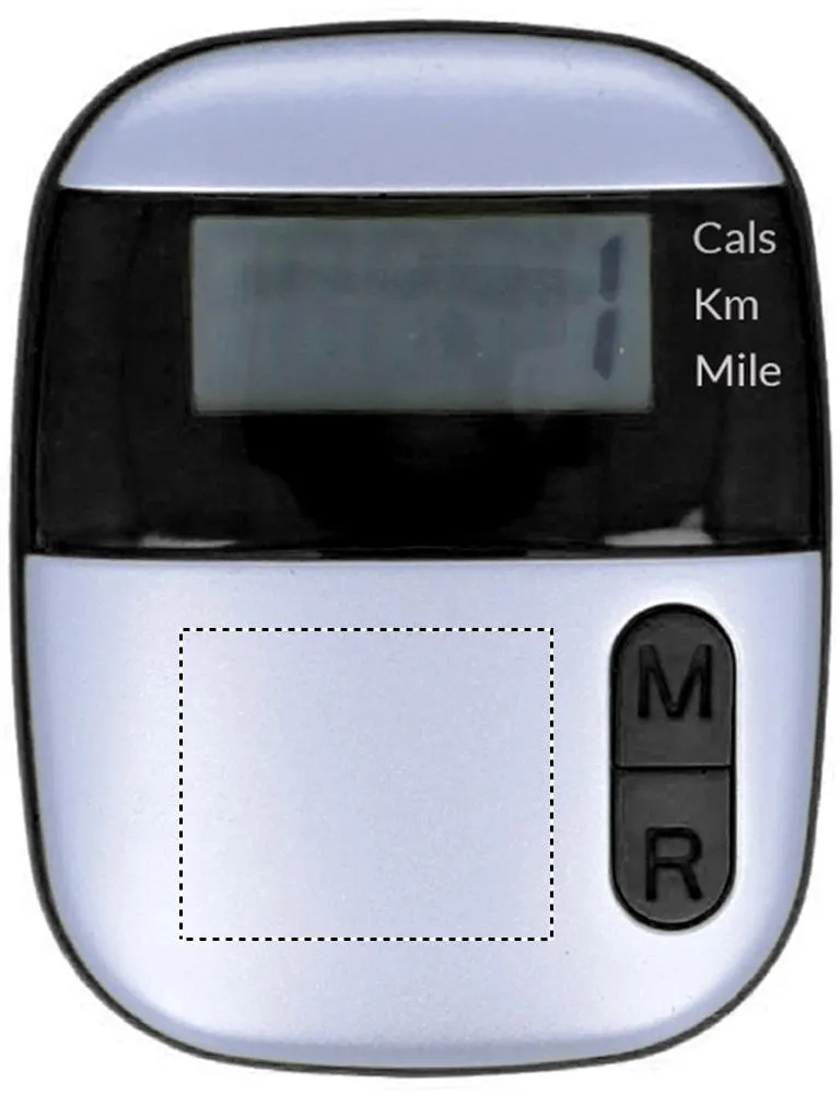 Pedómetro em ABS com clip. Conta passos, distância (milhas e kilómetros) e conta calorias. 1 pilha de botão incluída.Pedómetro