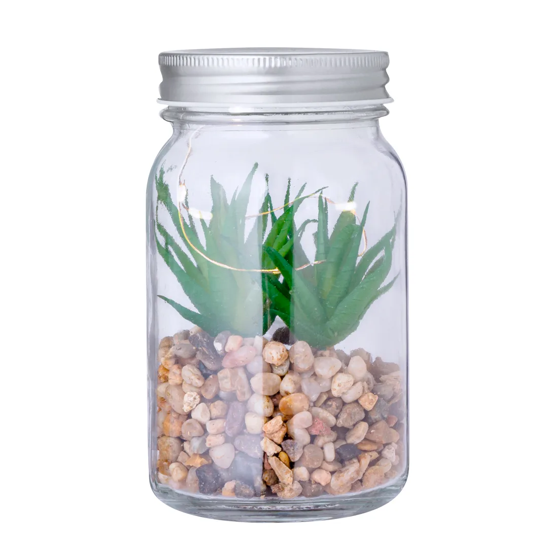 Planta decorativa sobre uma base de pedras, em frasco de vidro de borossilicato. Iluminada por 5 LEDs que funcionam com 3 pilhas AAA (não incluídas). Apresentada numa caixa de design kraft.Fabricada em vidro de borossilicato, que oferece uma resistência e durabilidade excepcionais, alargando a sua vida útil e podendo ser reutilizado uma infinidade de vezes.Vidro5 Leds. 3 Pilhas AAA Não Incluídas