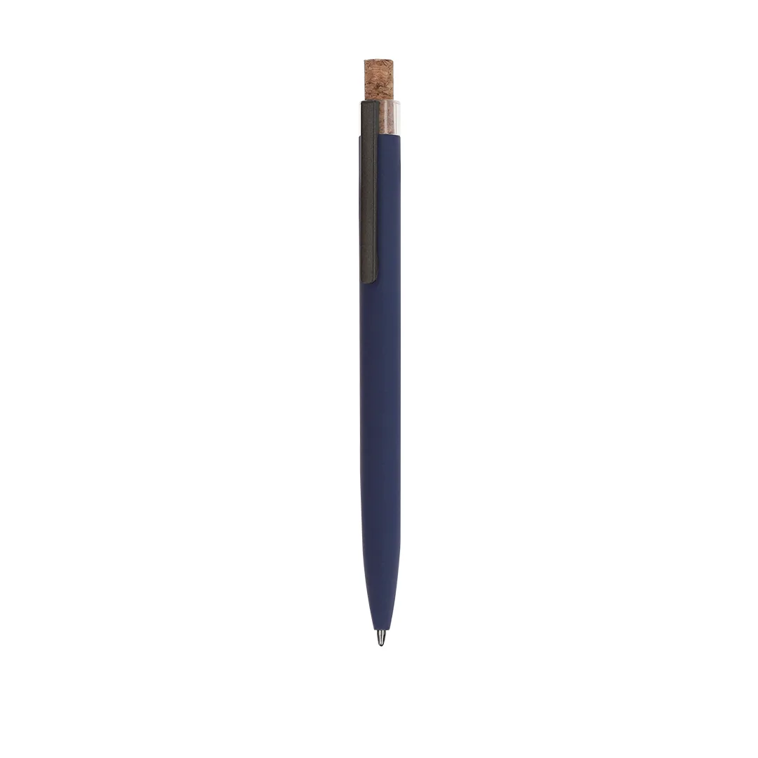 Caneta de mecanismo de botão fabricada em alumínio reciclado. Botão em cortiça e corpo com acabamento em borracha, especialmente projetado para marcação a laser. Clip metálico e distintivo alumínio reciclado na parte superior da caneta. De cartucho jumbo e em tinta azul. O alumínio reciclado é um material com possibilidades de reciclagem quase infinitas, sem perder suas propriedades originais e consumindo menos energia nesse processo.Certificação GRS (Global Recycled Standard / Padrão de Reciclagem Global), que garante a origem reciclada do material usado para fabricar o produto.Cortiça/ Alumínio Reciclado. Acabamento AborrachadoCarga Jumbo