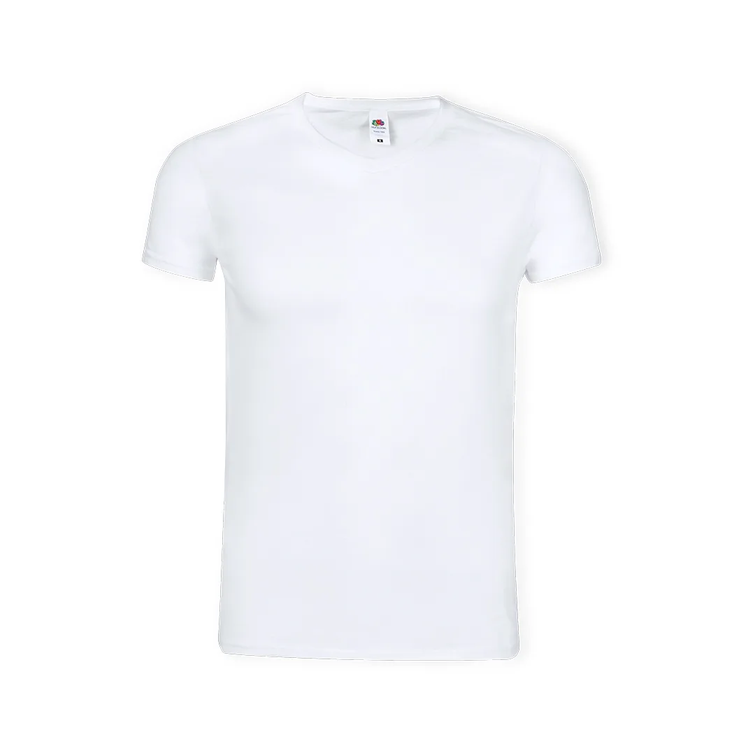 T-shirt branca icónica com decote em V da Fruit Of The Loom. Feito de algodão 100% penteado Anel Fiado de 140g/m2. Toque suave e corte moderno, com um decote em V nervurado 1x1. Etiqueta facilmente removível e disponível nos tamanhos S, M, L, XL, XXL.100% Algodão Penteado Ring Spun 140 g/ m2