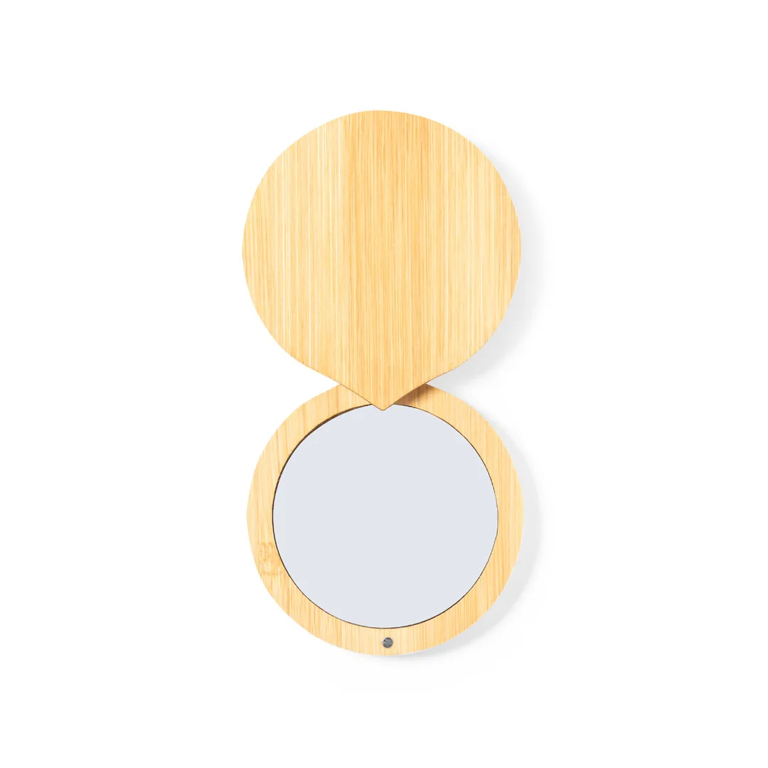 Espelho 1X da linha nature, com carcaça fabricada em bambu e fecho magnético. Apresentado numa caixa individual de design kraft.Bambu