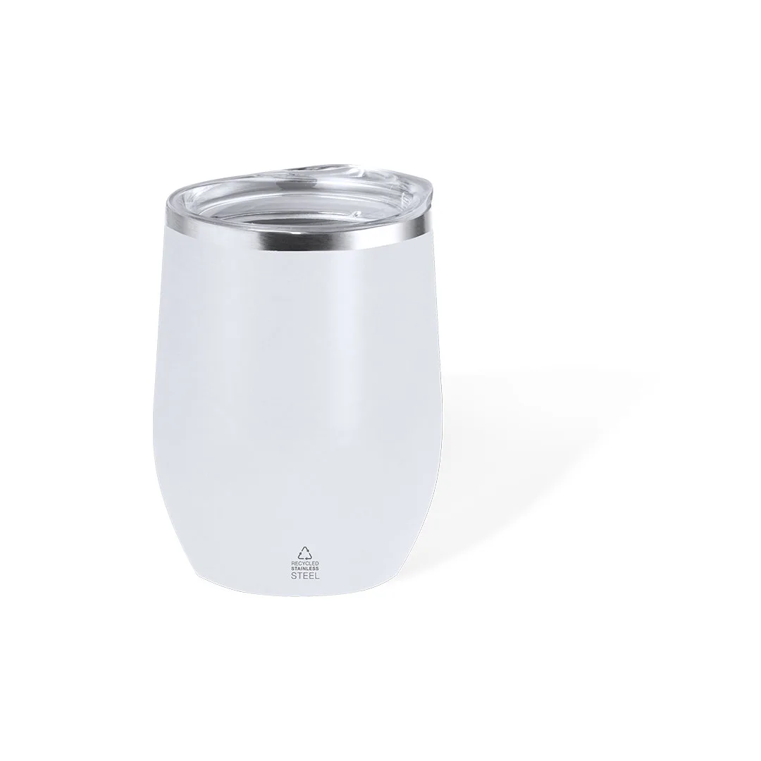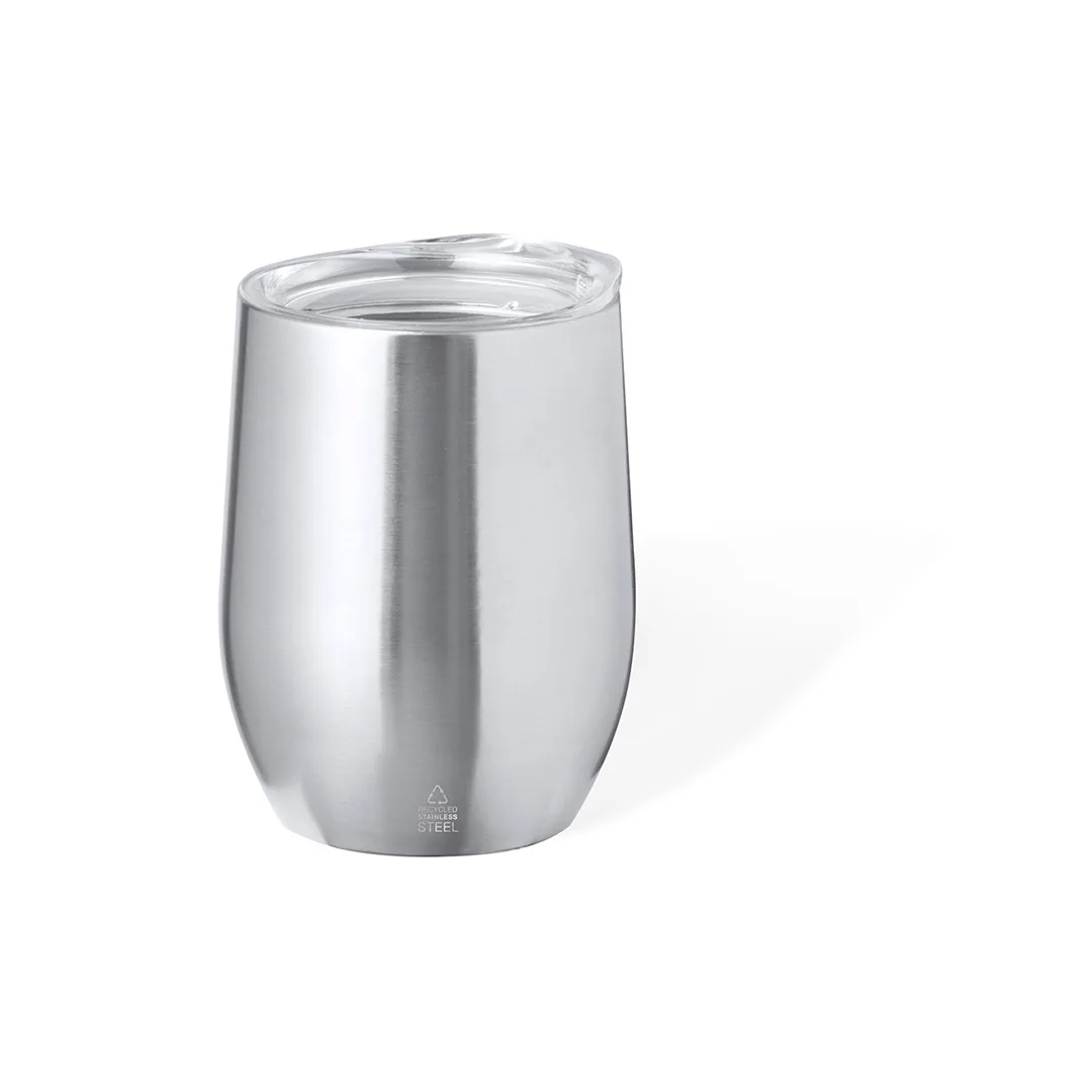 Copo térmico fabricado em aço inox reciclado, com parede dupla e 340 ml de capacidade. Inclui tampa transparente com fecho de pressão e doseador. É ideal para ter na sua escrivaninha, mesa ou em qualquer superfície onde possa desfrutar tranquilamente da sua bebida favorita. Com logotipo Aço Inox Reciclado.O aço é um dos materiais mais solicitados e pode ser encontrado em quase todo o lado, desde os produtos produtos de uso diário a grandes construções. Com inúmeras propriedades, entre as quais há que destacar a durabilidade e o seu alto grau de reutilização, convertendo-o numa alternativa muito valorizada em soluções de sustentabilidade. Devidamente tratado, permite obter novos recursos de infinita utilização.Aço Inox Reciclado340 ml
