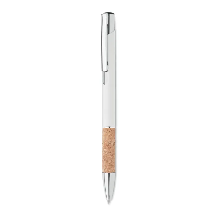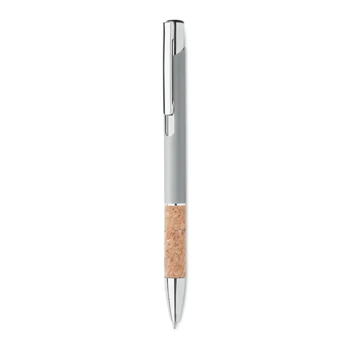Esferográfica de botão de pressão em alumínio com pega em cortiça. Tinta azul.Caneta de alumínio com cortiça