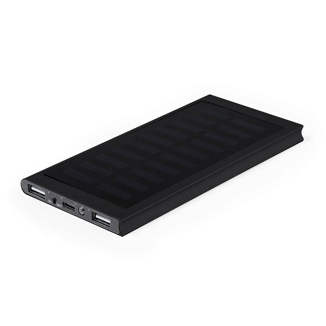 Bateria auxiliar externa de recarga solar e com grande capacidade de carga -8.000 mAh-. Fabricada em alumínio, com conector de entrada/saída Tipo C e 2 saídas USB. Apresentada em caixa individual de design kraft. Manual de instruções disponível em espanhol e inglês.As capacidades mostradas em todas as nossas baterias auxiliares externas são reais, incorporando todas elas baterias de grau A e não recicladas, com uma vida útil de pelo menos 500 ciclos de carga e segundo normativa CE. Além disso, são fabricadas conforme as normas RoHS e em cumprimento com os seguintes requisitos de segurança:Sistema de proteção contra sobrecarga do power bank. Sistema de proteção contra descarga completa que proporciona uma maior durabilidade do power bank. Sistema de bloqueio para evitar curto-circuitos. Sistema de transferência de carga constante, de acordo com a capacidade do dispositivo de destino.Alumínio1 Led. 2 Posições de Luz, Fixa e Intermitente. 8000 mAh. Carregamento Solar. 2 Saídas USB. Saída e Entrada Tipo C
