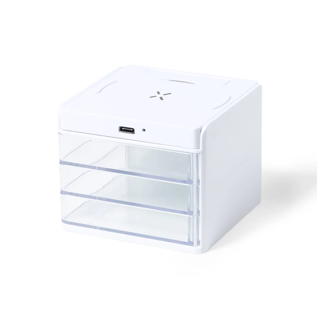 Carregador organizador com suporte para smartphone e carregador sem fios de 10W integrado, compatível com dispositivos equipados com a tecnologia de carregamento sem fios Qi. Com 3 compartimentos de armazenamento transparentes e amovíveis. Indicador do estado de carga, com cabo de carga Tipo C de 1m incluído. Base antideslizante e apresentado em caixa individual de design kraft, com manual de instruções em espanhol e inglês.Fabricado de acordo com as normas RoHS e em conformidade com os seguintes requisitos de segurança:Sistema de proteção contra o sobreaquecimento.Sistema de proteção contra sobrecarga.Sistema de bloqueio para evitar curto-circuitos.Sem Fios 10W