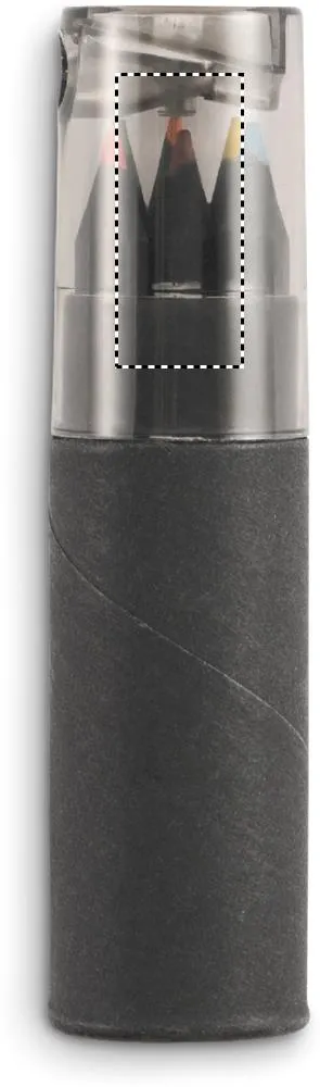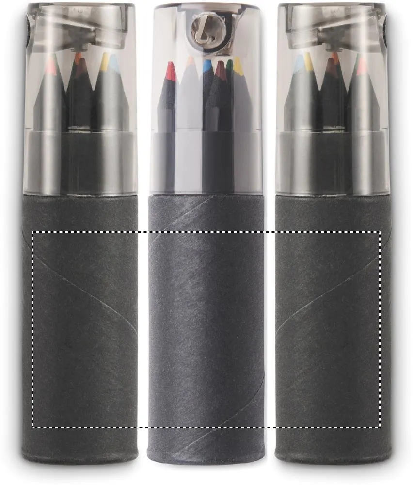 6 lápis de cor, em caixa de cartão rígido tubular preta com afia na tampa.Estojo com 6 lápis de cor